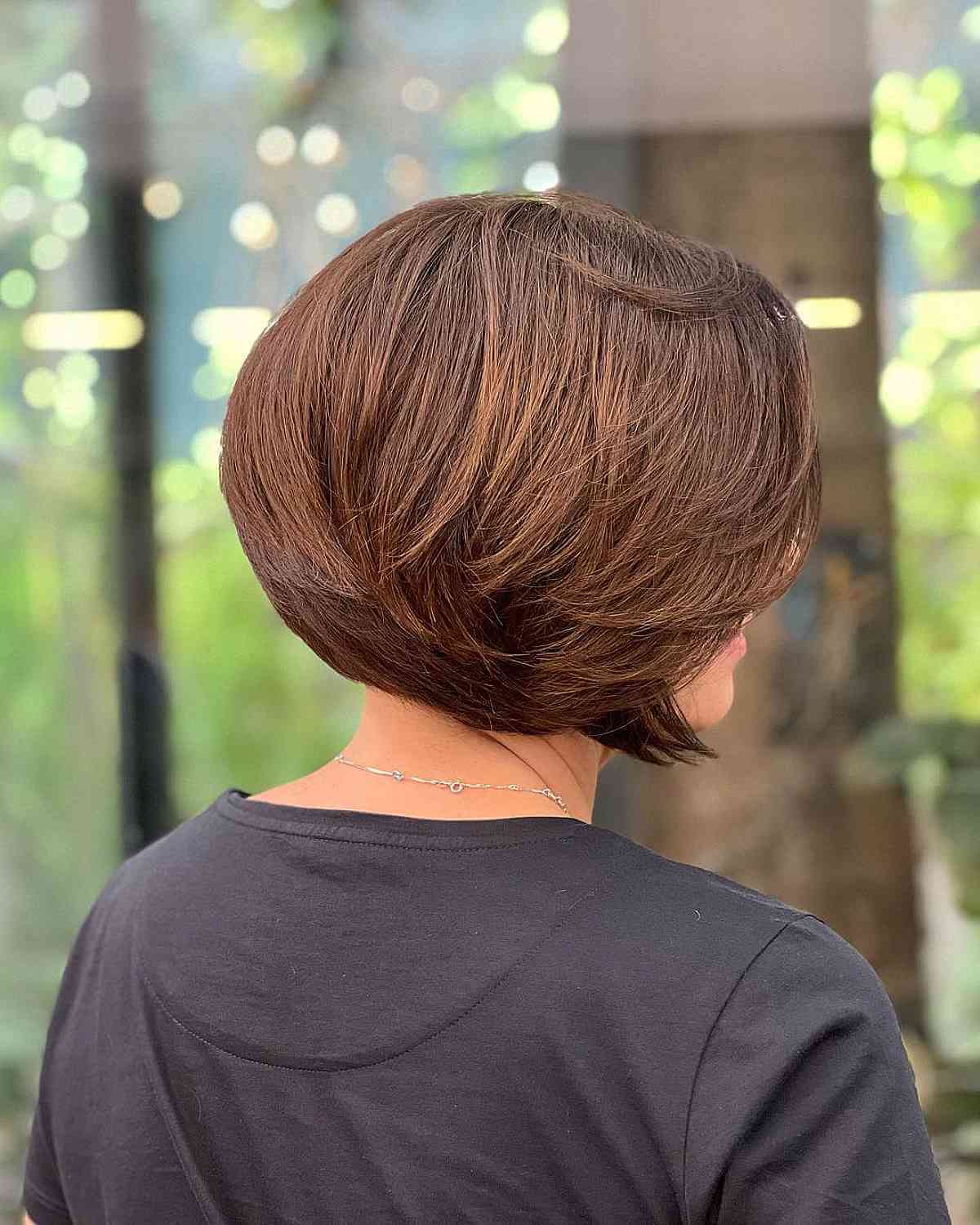 This A-line bob short haircut features abundant stacked layers that create a delightful fluff and puff effect at the nape area. The A-line bob with layers encircling the head forms a rounded silhouette, while tapered edges ensure a smooth flow towards the ends.