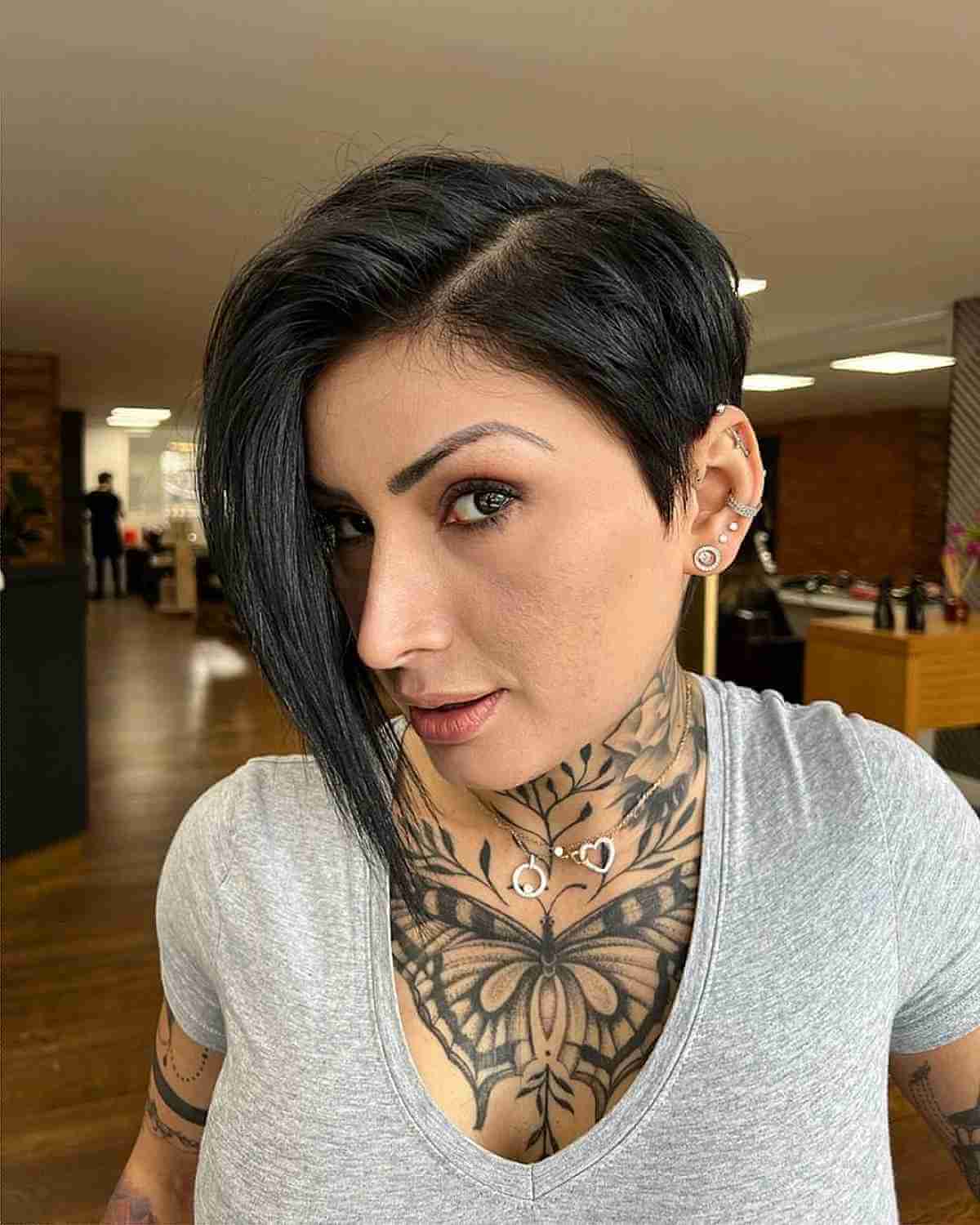 If you’re seeking a distinctive look, consider a one-sided haircut like this stylish asymmetric cut with a shaved side. An asymmetrical design complements various face shapes, and the shaved aspect enhances the overall impact. You can use a low part to sweep all the longer hair to the other side and make a statement. Interestingly, if you opt for a higher part, you can drape hair over the undercut and conceal it for a softer appearance. Experiment with this asymmetrical pixie cut with an undercut; its versatile shape is sure to impress.