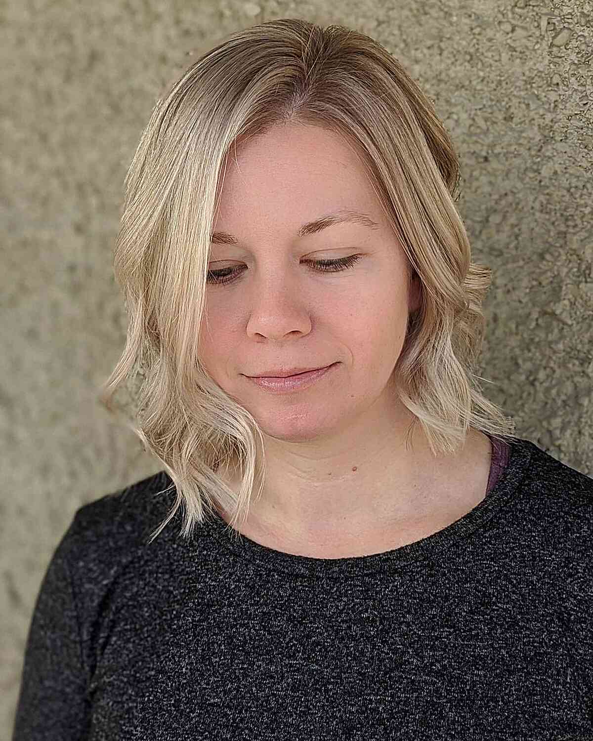 This chic asymmetrical hairstyle for blonde locks enhances the facial structure, featuring side bangs that minimize width to create a more elongated appearance. Layered and choppy finishes add definition to round faces.