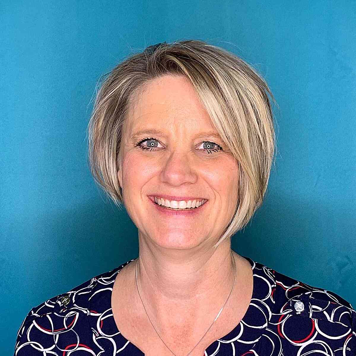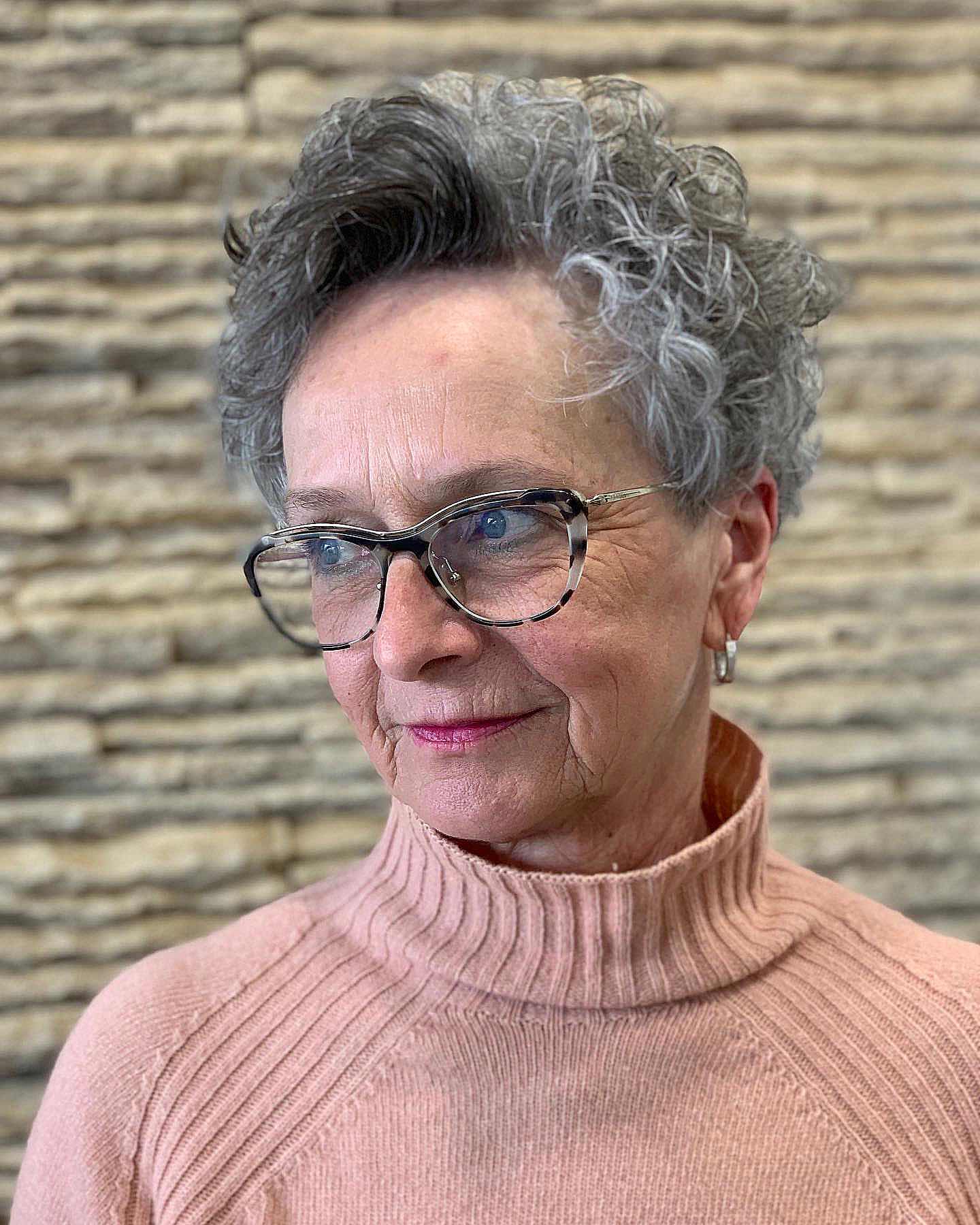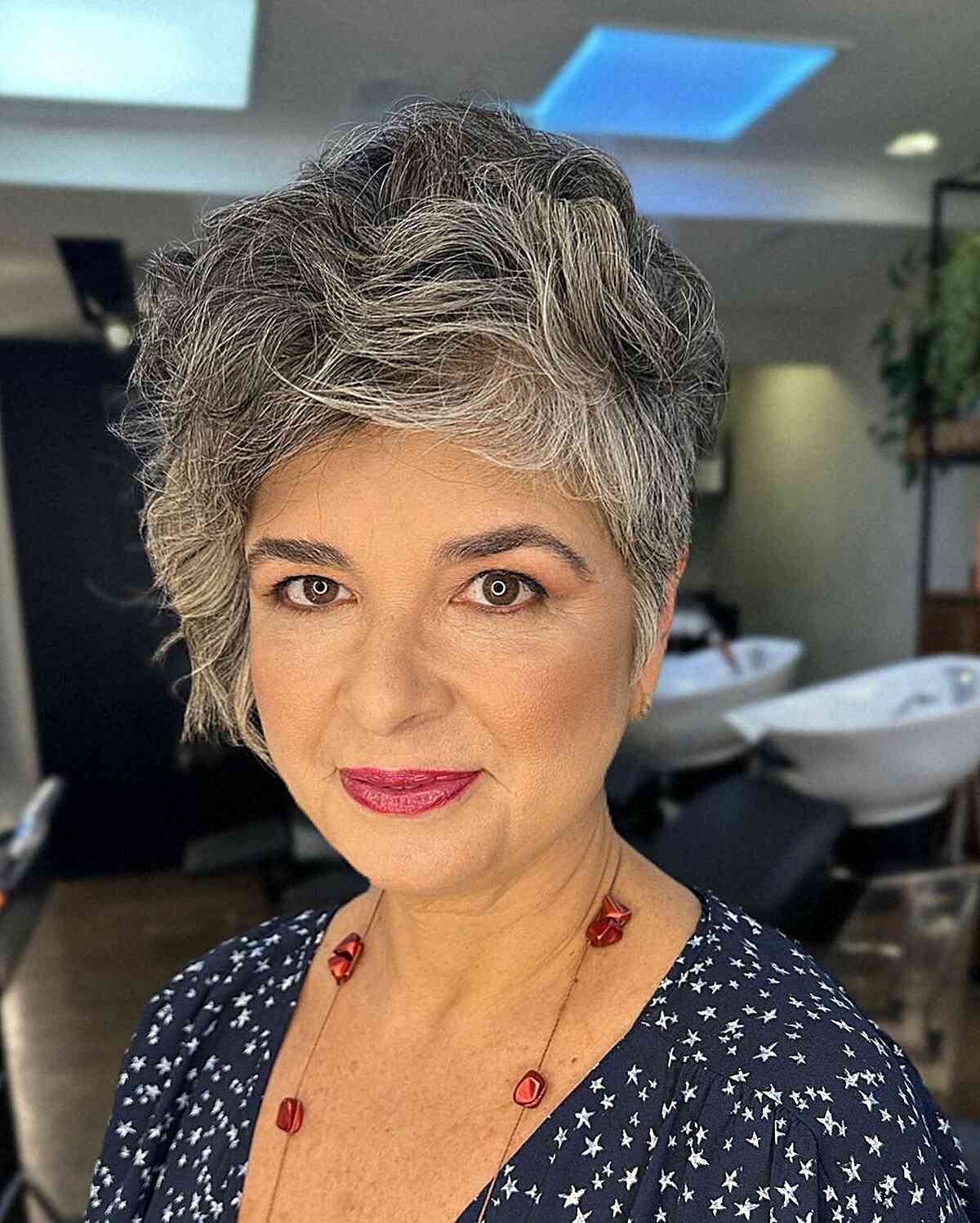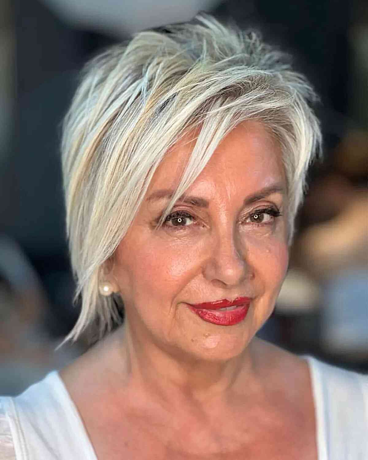 An asymmetrical pixie hairstyle with silver balayage is attractive. If you have thicker hair, this cut might be a great option. It removes excess bulk and weight from one side and helps balance a rounded face shape seeking more height at the crown. A deep part can enhance the crown volume, making it a contemporary, flattering style for women who are maturing.