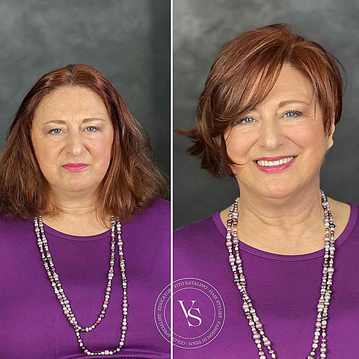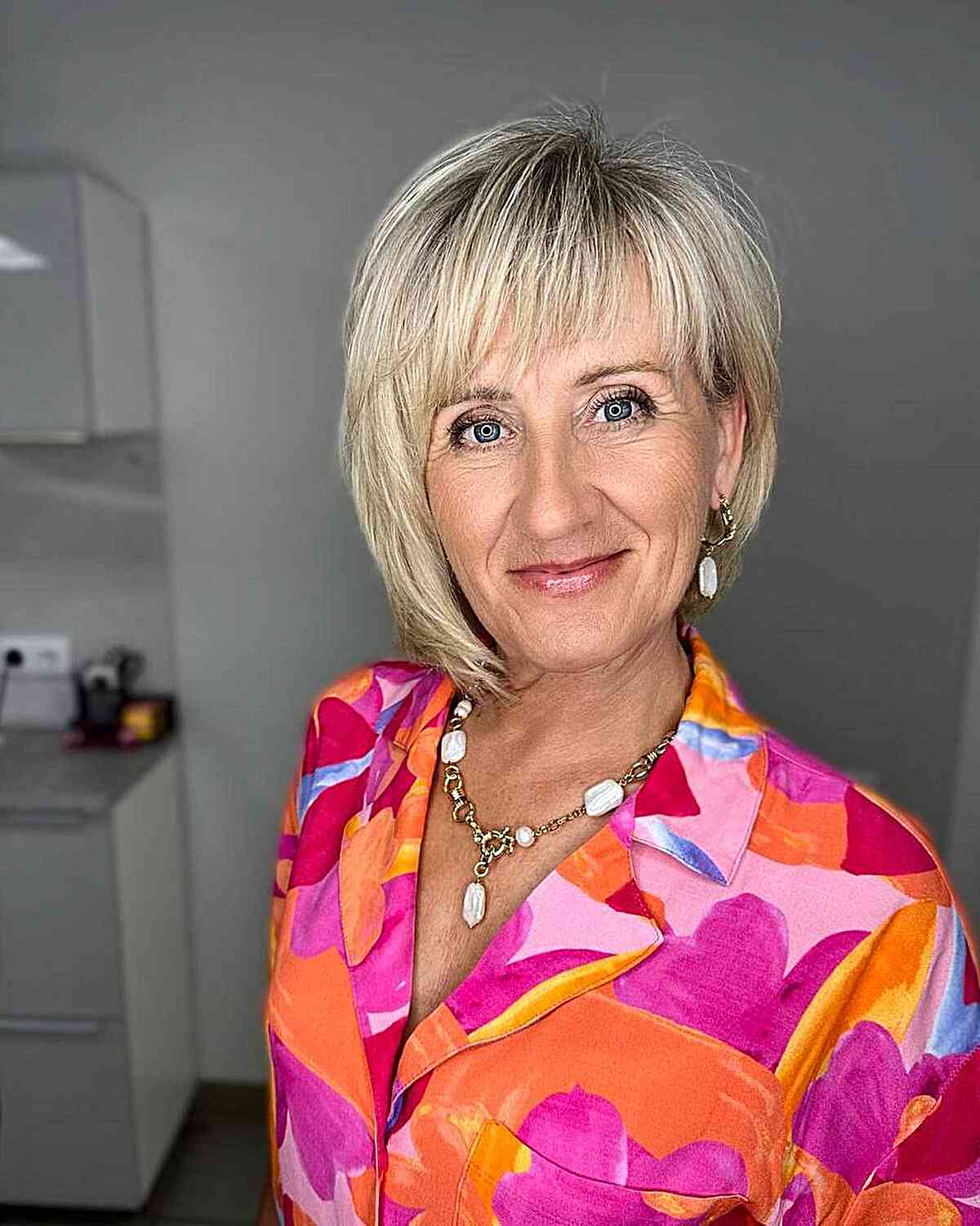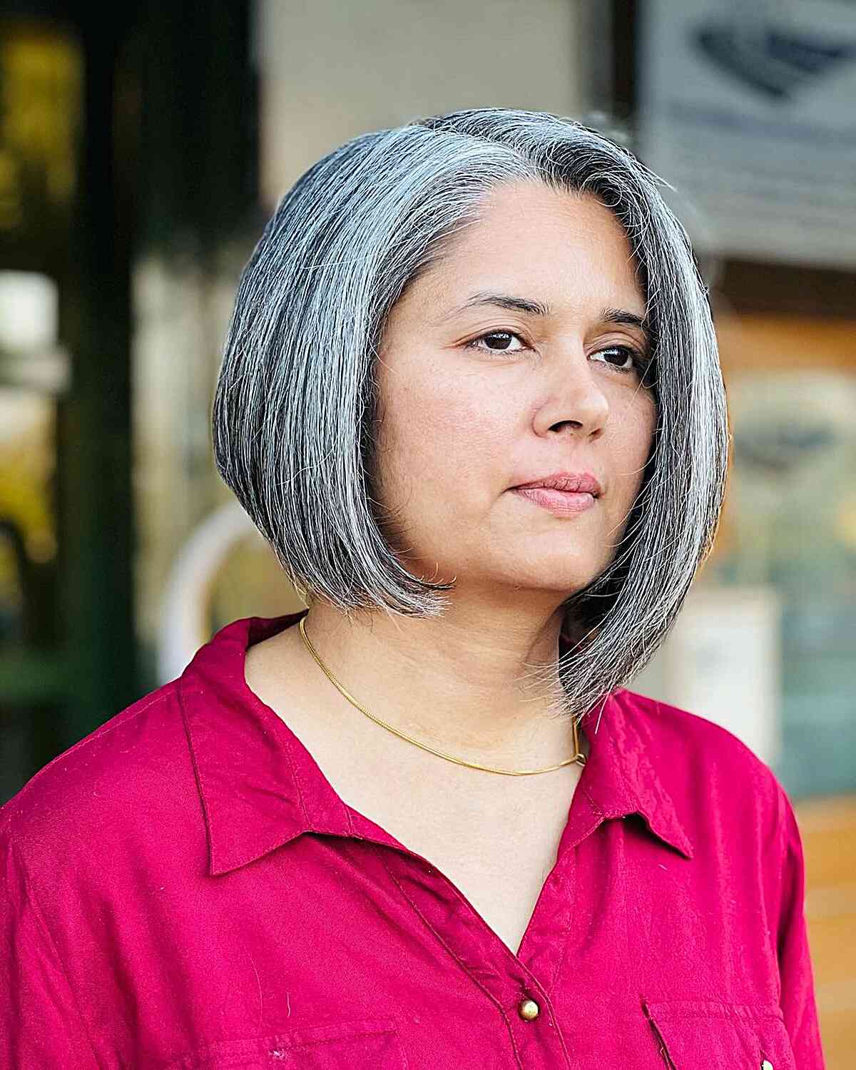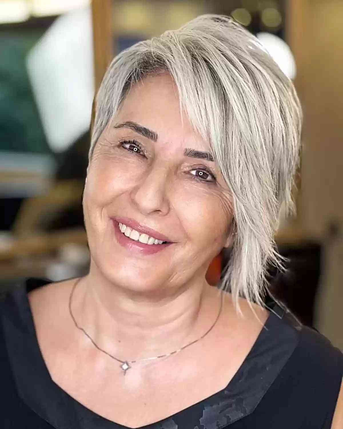 A stylish asymmetrical haircut for mature women with gray hair is a fantastic option, especially for those who desire a contemporary and youthful appearance while ensuring low maintenance.