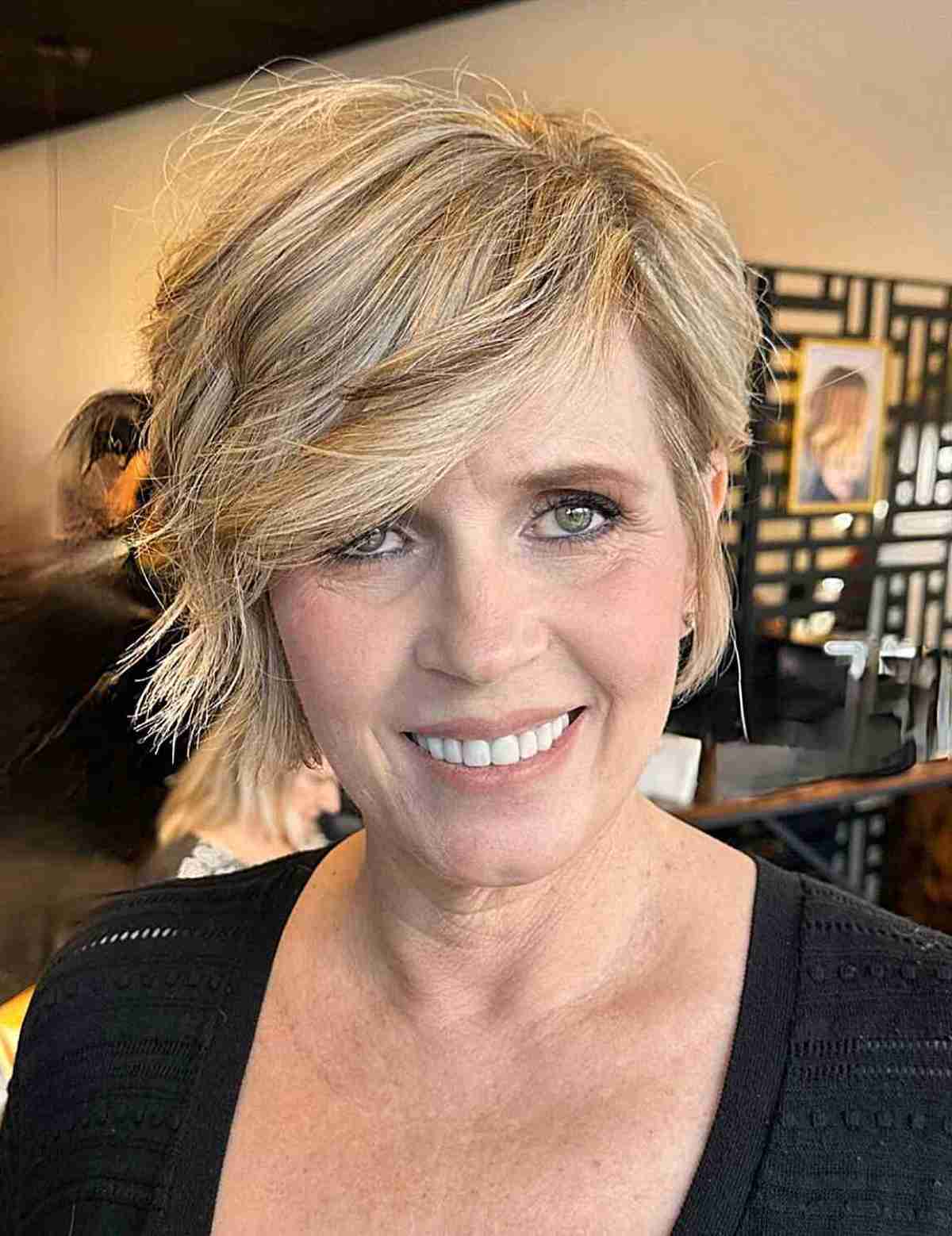 For a stylish asymmetrical short hairstyle, a side-swept cut is exquisite for women with fine hair, providing a fuller appearance. A side-swept bob features multiple layers and elongated face-framing strands to enhance facial features.