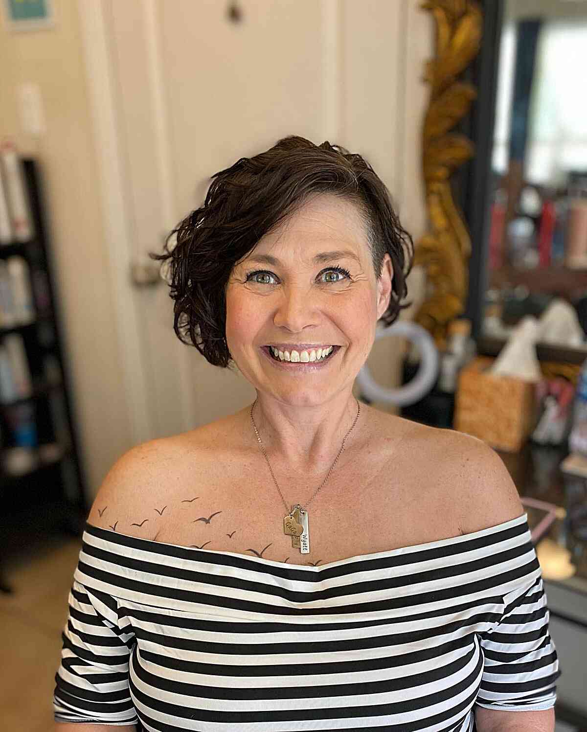 Short curly hair with a deep part to one side enhances a captivating asymmetrical style. This curly pixie hairstyle is ideal for women with naturally curly locks but can also be achieved with a curling iron. Softening the edges will transform the look of this asymmetrical haircut entirely.