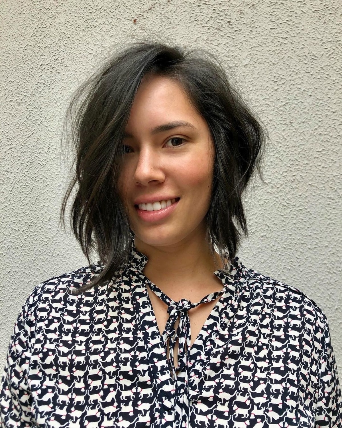 This tousled, short hairstyle featuring an asymmetrical cut and bangs presents a contemporary flair. It brings a refreshing twist to any appearance. Ideal for those seeking a low-maintenance yet fashionable look, this style incorporates textured layers and lively bangs. The asymmetrical design captures visual interest and balances facial features beautifully. If your hair has a straight-to-wavy texture, this cut enhances the tousled effect seamlessly.