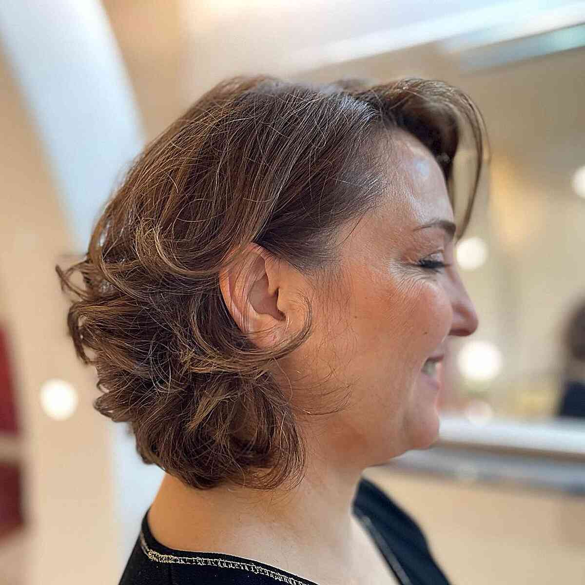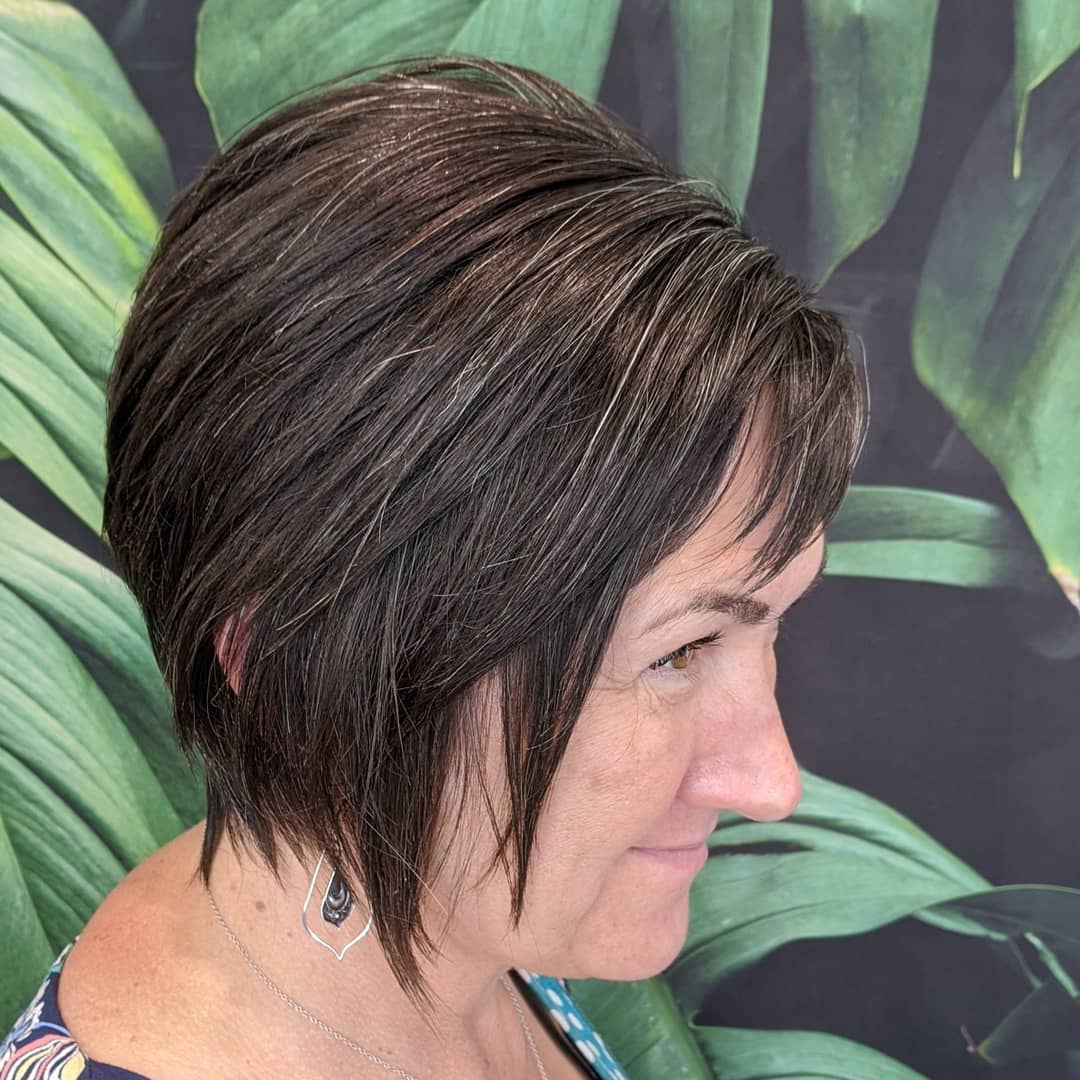 A warm brown extended pixie with textured bangs is the ideal style choice for a more vibrant look. If you want to style your mature hair in a way that maximizes fullness, short hair with highlights is the best approach. To achieve a warm brown hue, consider applying a sealer over the highlights for toning. I suggest styling your hair forward with slight volume. This will minimize visibility to the scalp. You might add a volumizing spray before drying to enhance your tresses.