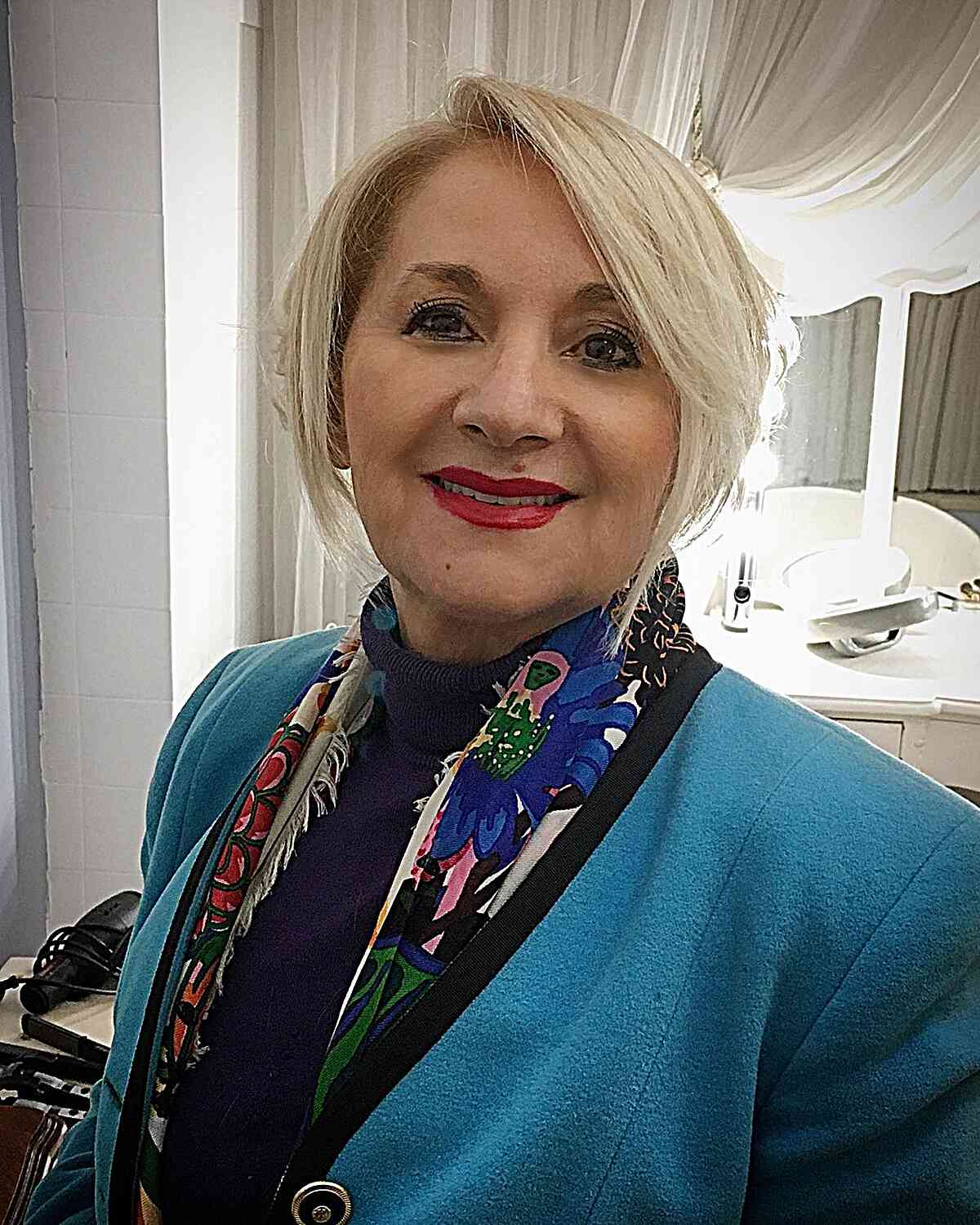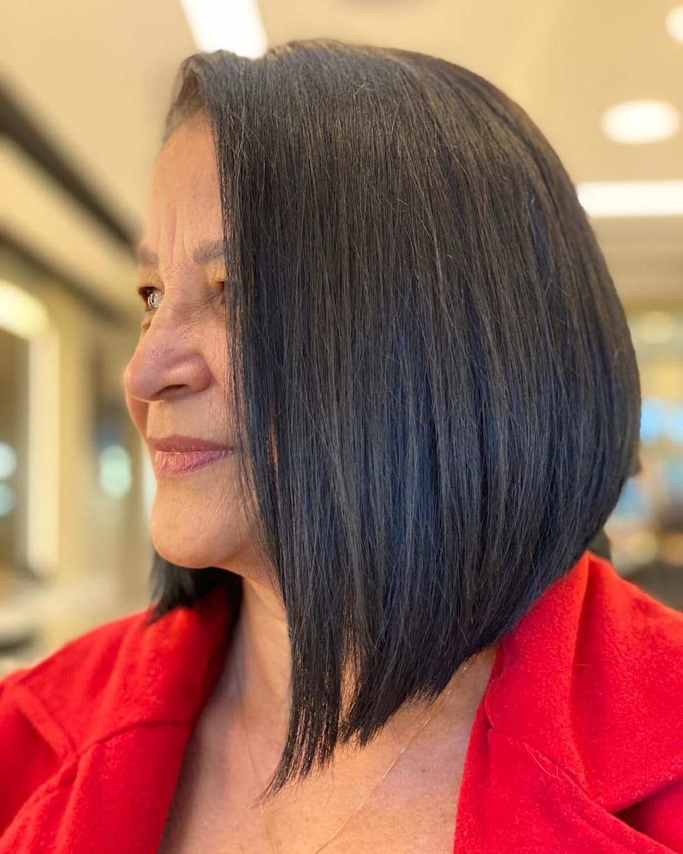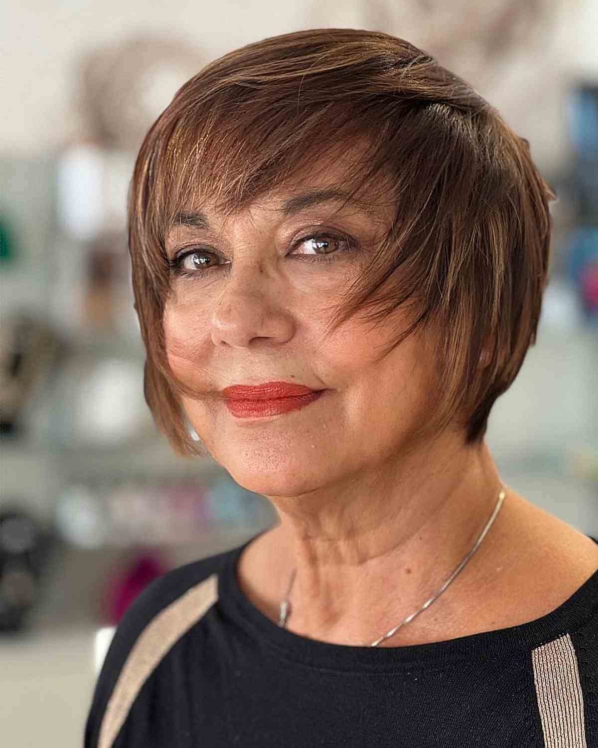 A stunning graduated bob looks fantastic on mature women. This short hairstyle offers a chic and edgy look. It even features side-swept bangs for an added youthful charm. A short bob like this is easy to style, yet upkeep could be a bit demanding.
