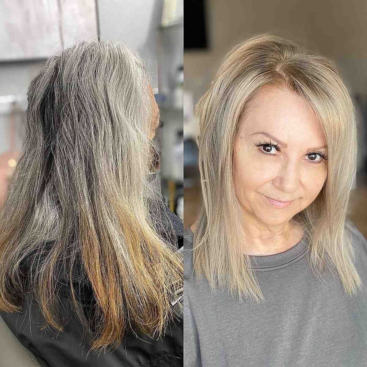 Embrace the beauty of aging with this elegant silver-thin blowout. Tailored for fine hair, it features subtle layering that enhances volume, particularly around the crown, while minimizing bulk to avoid a heavy appearance. Ideal for oval faces, the silver hue brightens the complexion, offering a rejuvenating update that’s easy to maintain yet stylish. While it provides a rich dimension, regular salon visits might be necessary to preserve the color brilliance. A seamless blend of sophistication and manageability for our mature women!