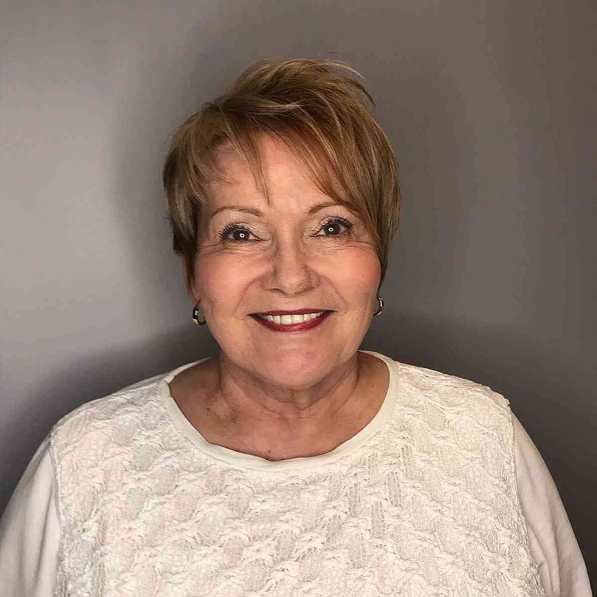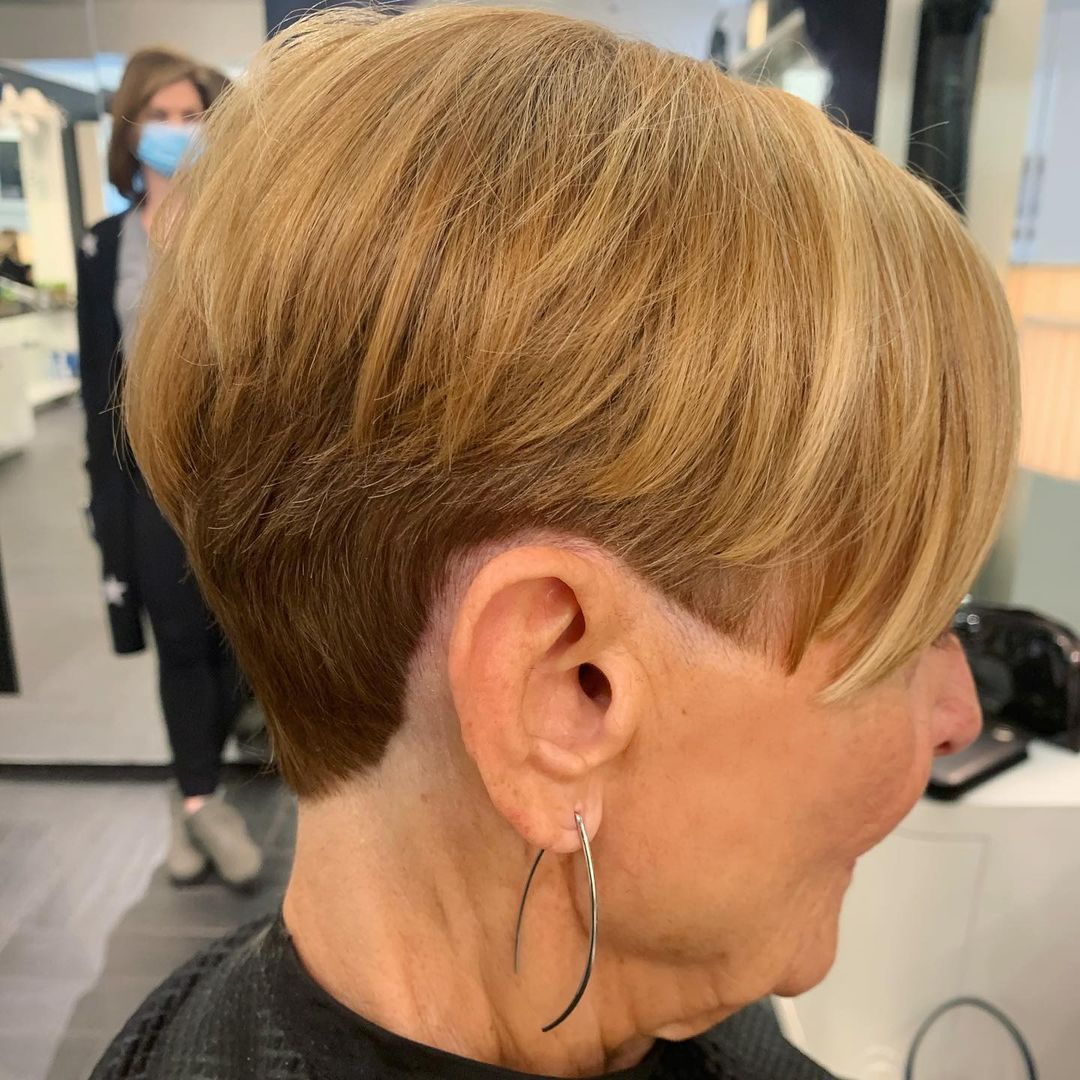 This chic crop for women over 60 is packed with elegance! The layers in this crop create a dynamic texture. When styled towards the back and paired with a platinum blonde hue, it results in a fashionable and sleek appearance. Maintain volume at the front for added height and to give the hair a fuller look.
