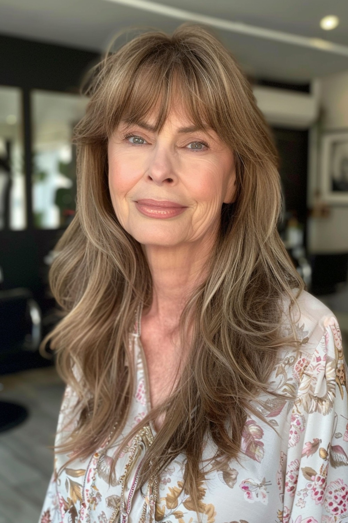 Consider a brunette balayage with a forward brushed style. Cutting off dead weight will enhance your aging hair’s appearance, making it appear thicker and fuller. Layers will provide your fine hair with added body for a denser look. You can choose bangs or a face frame to soften forehead lines and wrinkles, giving a more youthful and gentle look.