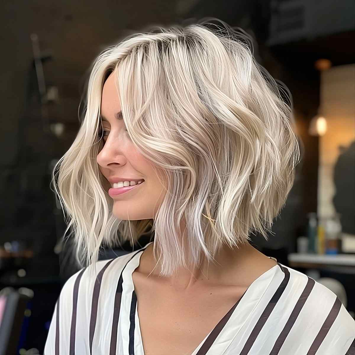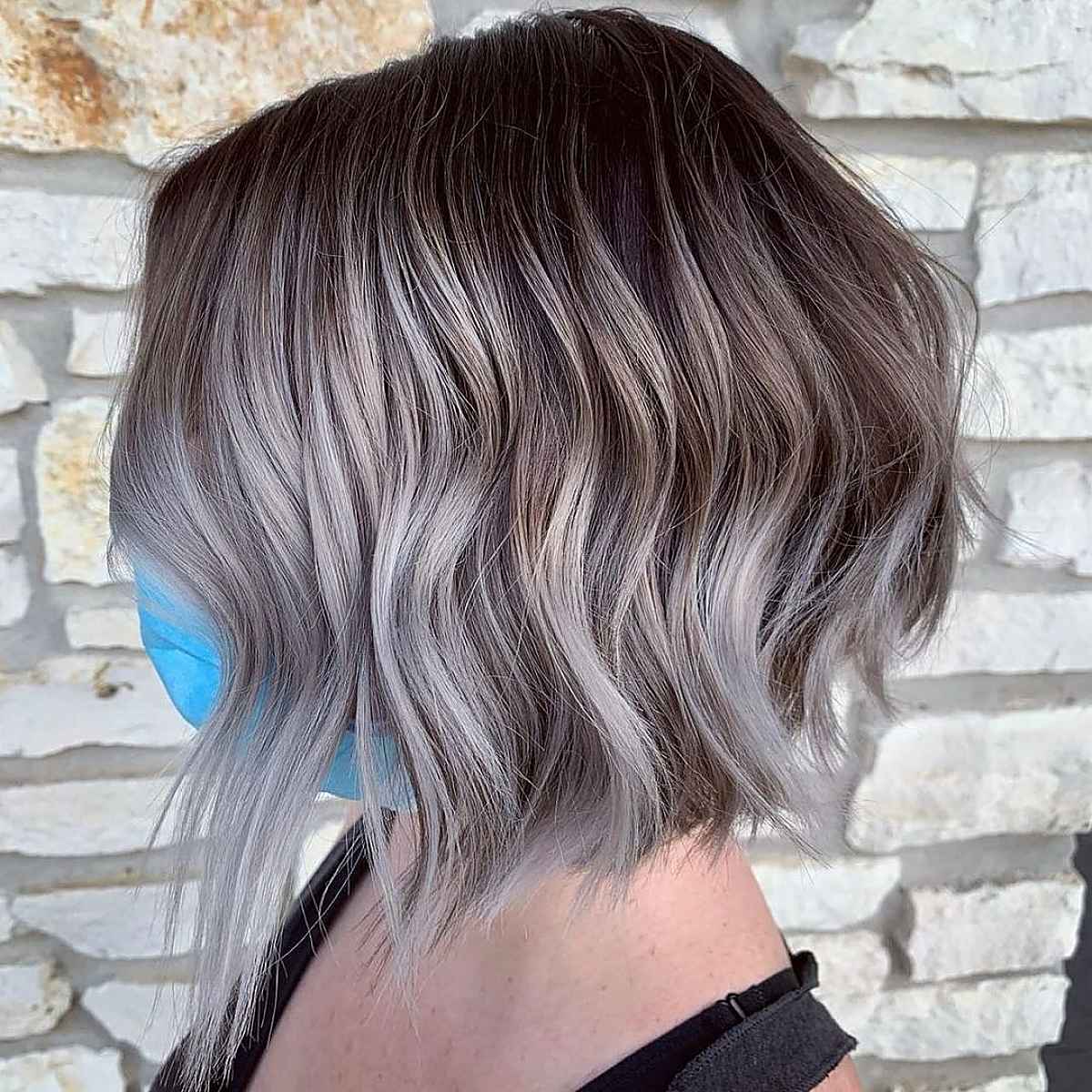 Textured Inverted Wavy Bob Featuring a Silver Balayage