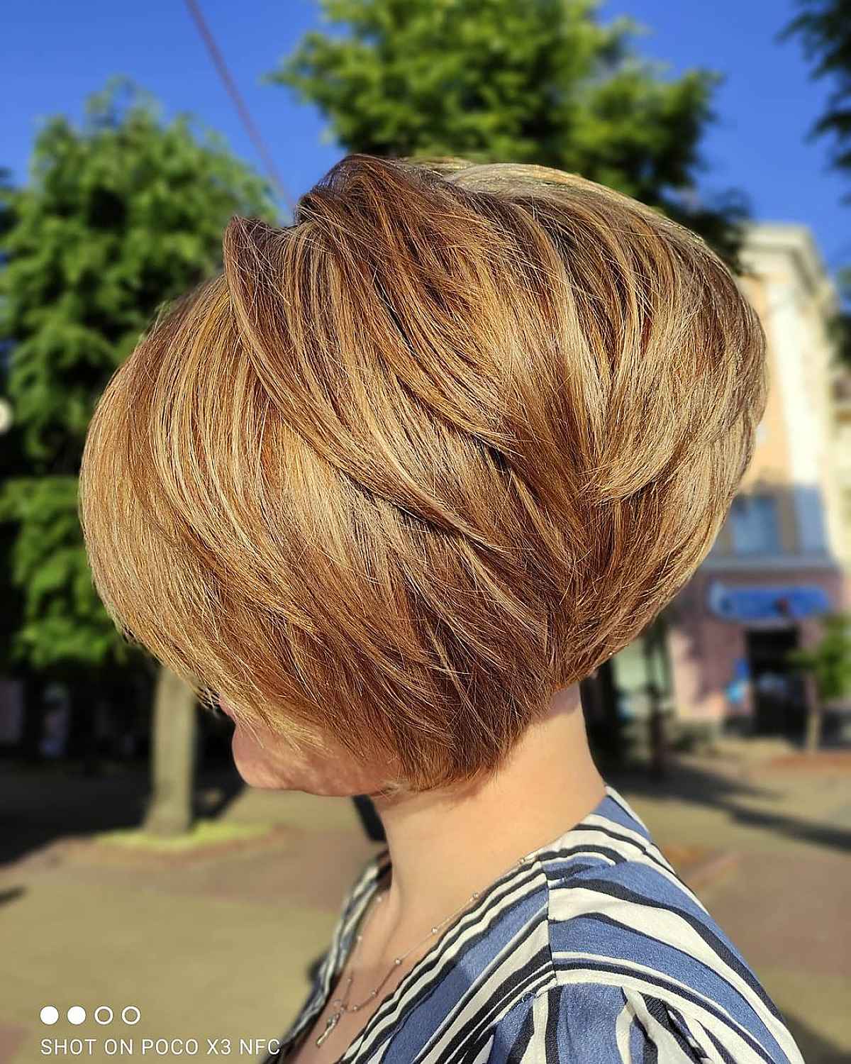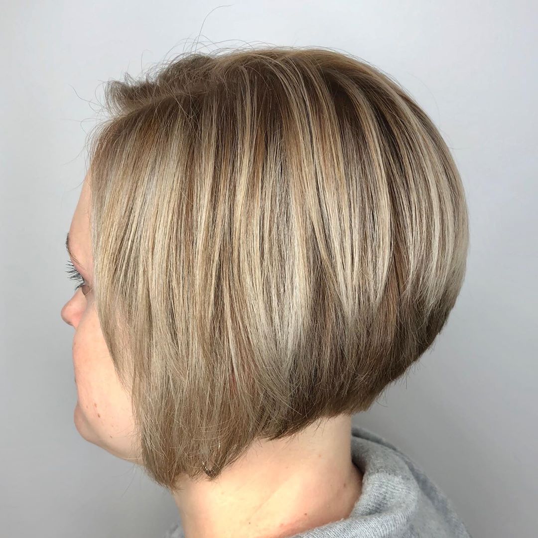 This chic very short layered inverted bob is perfect for showcasing your dimensional blonde balayage hair. The hairstyle is ideal for enhancing hair volume and adding vibrancy to babylights. A bob of this length looks fabulous on women with thick, straight hair.
