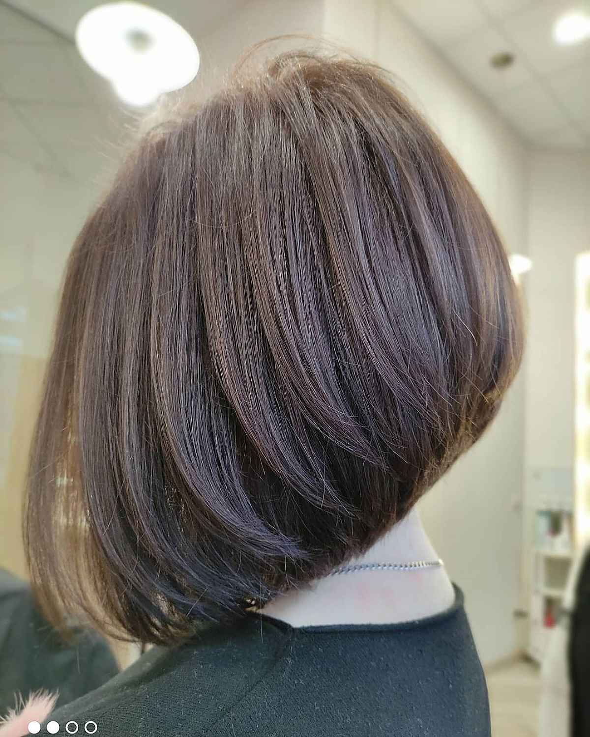 A layered inverted bob is a short to medium-length hairstyle with an angled or graduated nape. It typically has a rounded silhouette that adds instant volume to the hair.