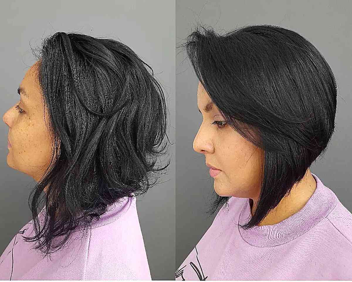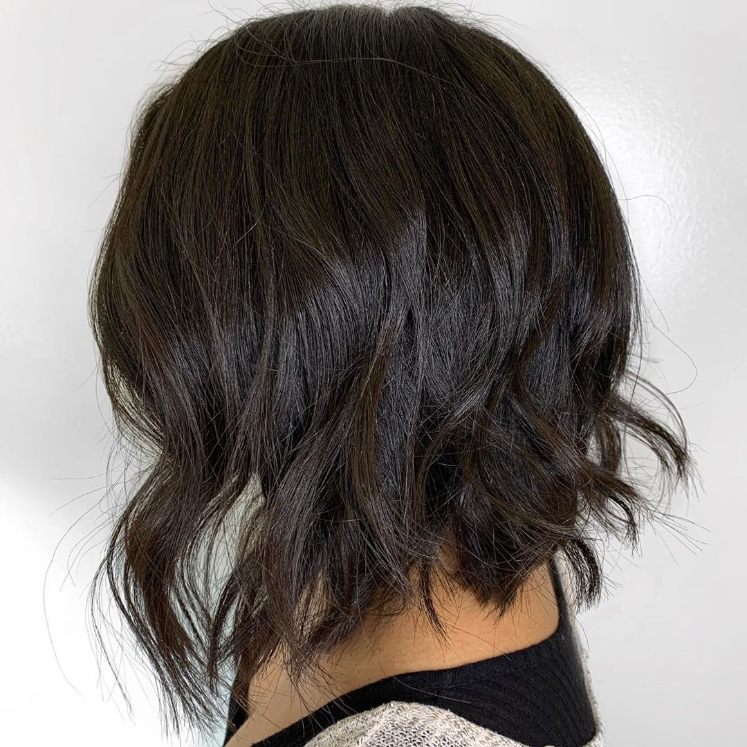 This choppy inverted bob with layers brings a bold change while maintaining a contemporary vibe. The color was transformed to a deep dark brown, along with trimming 6 inches to achieve a sleek yet elegant angled bob.