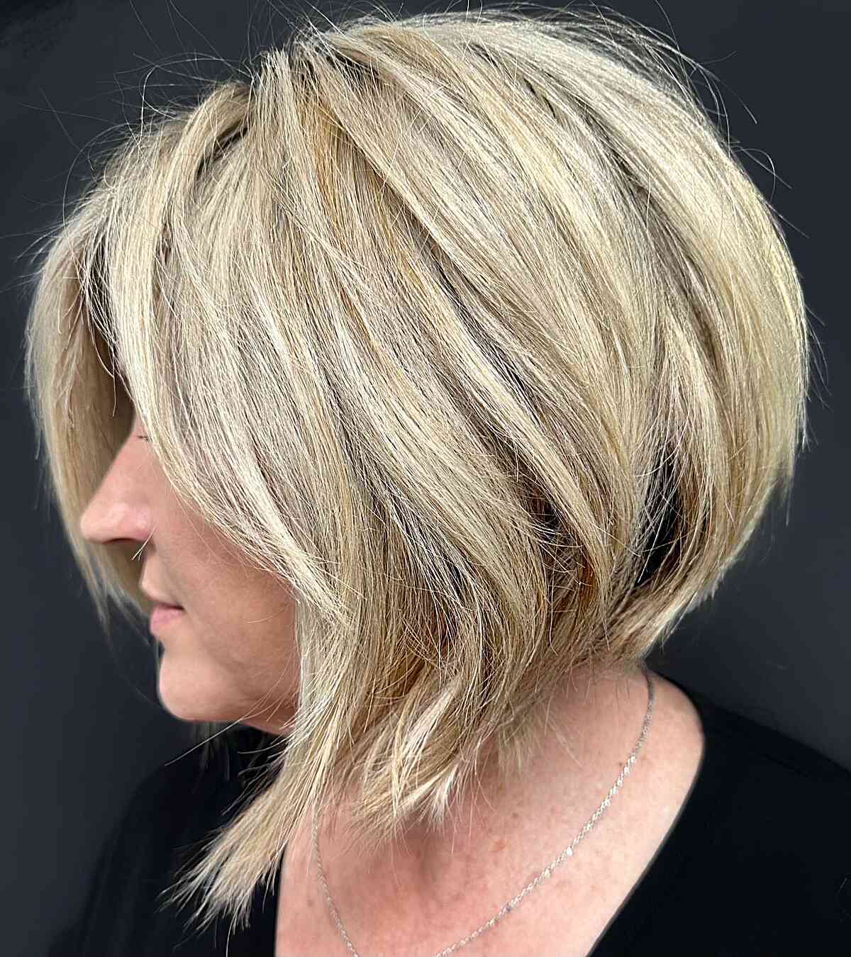 The cut and color of this shoulder-length inverted bob hairstyle with side bangs work exceptionally well, enhancing facial features. The vibrant blonde shade brings out a radiance around the face. If you’re a mature woman, you can confidently sport this layered bob cut.