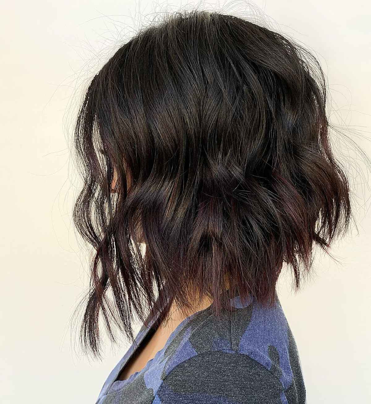 Choose a perfect layered inverted bob for thick, wavy hair. It’s a short to mid-length hairstyle with a dark hair tone, making it easy to maintain. One benefit of this layered, wavy inverted bob is that minimal effort is needed for styling. The texture will enhance the soft, layered waves at the tips.
