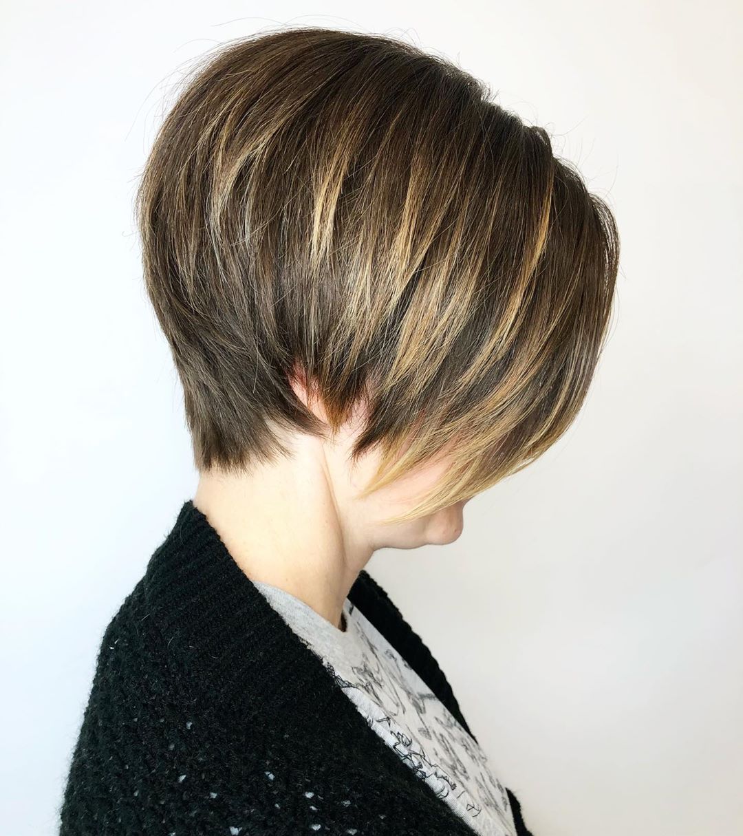 A layered inverted pixie bob is a fantastic option if you’re thinking about a short hairstyle. Blonde highlights on dark hair are beautifully accentuated against the textured ends. Choose this layered pixie bob to enhance your oval face shape, too!