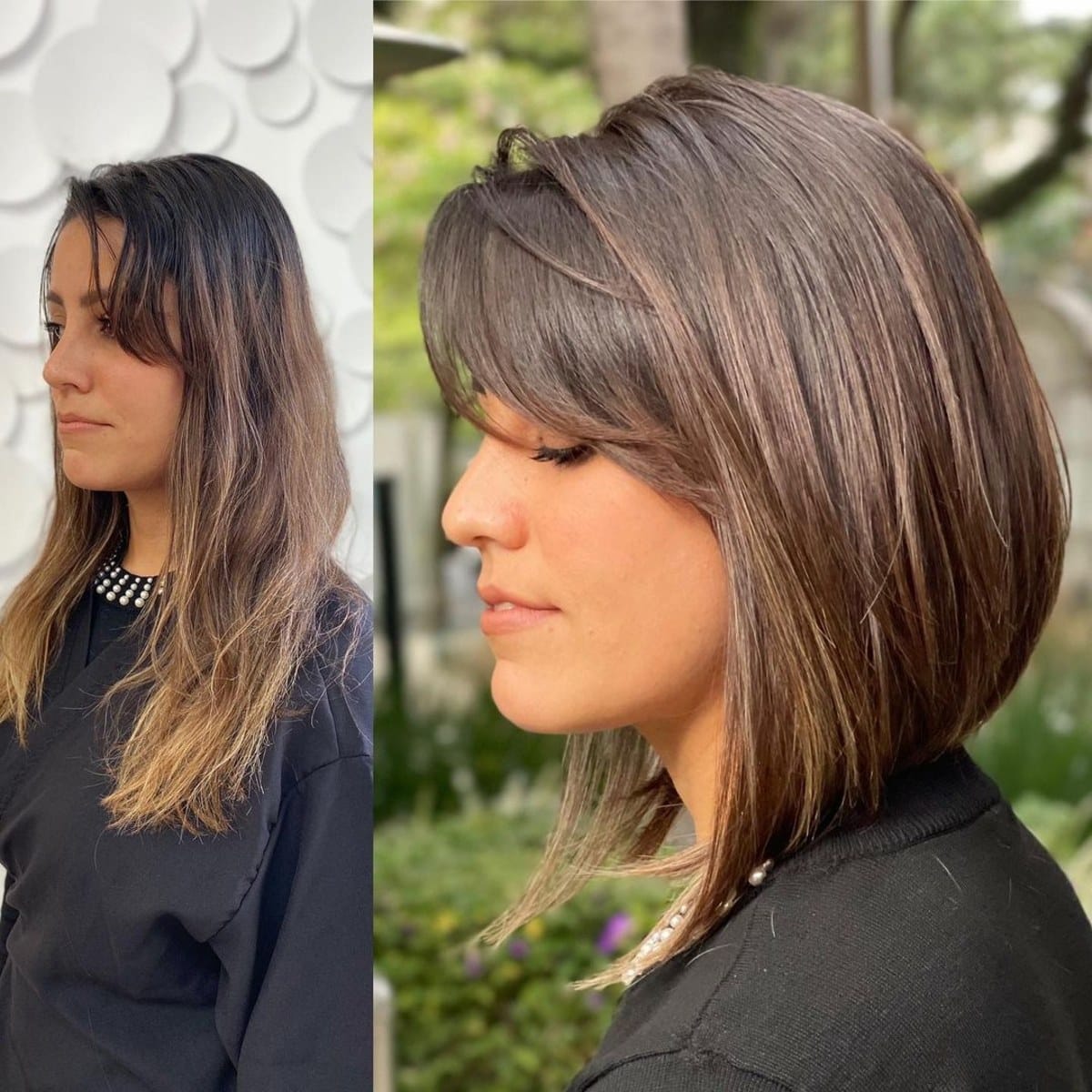 Looking for a bold transformation to enhance your bronde hair? A chic stacked, layered, inverted bob with bangs will provide you with a playful style. Created by stylist Jean Claude of Lebanon, the key feature of this neck-length bob haircut is its layers. Ideally, its styling should be voluminous yet very natural.