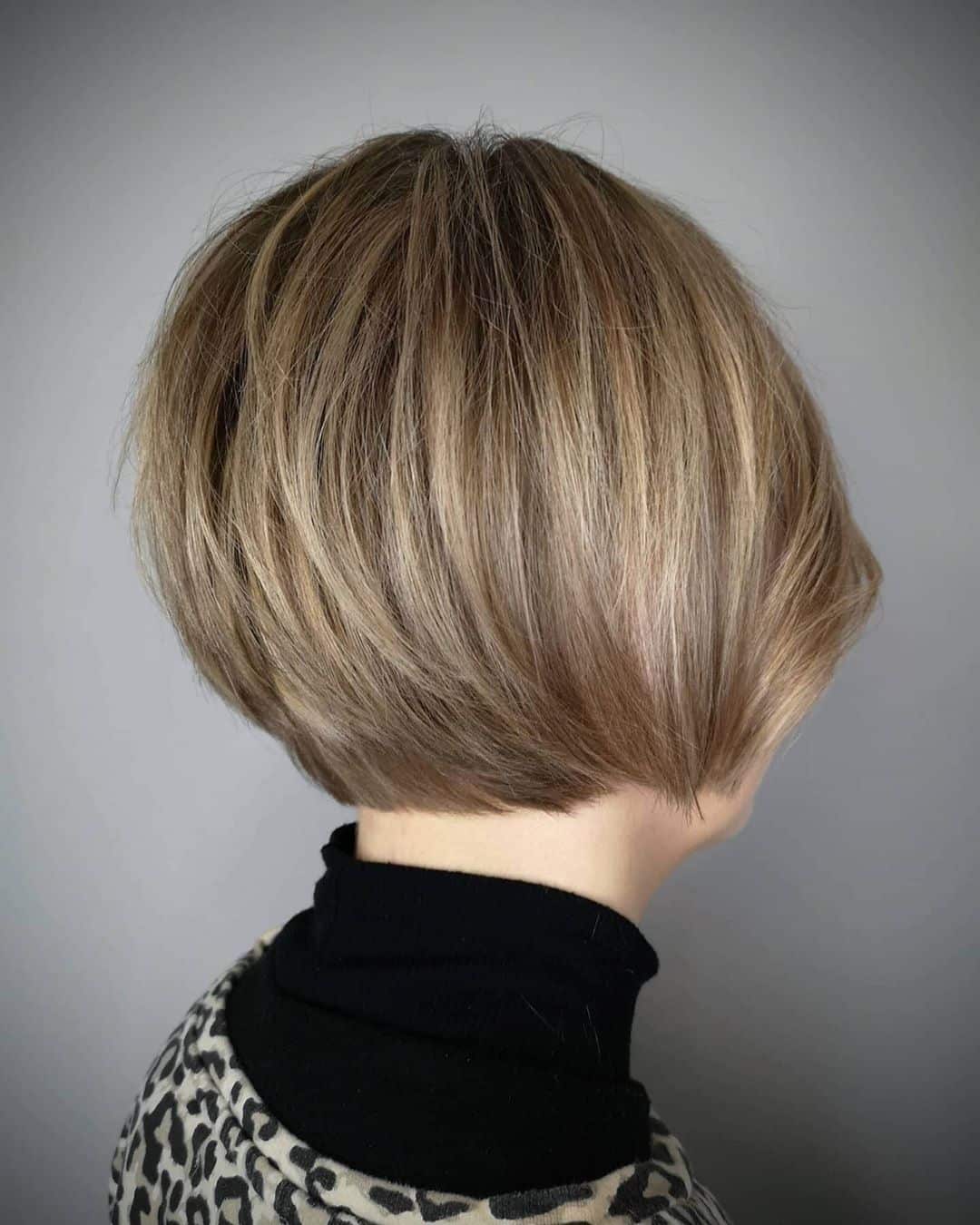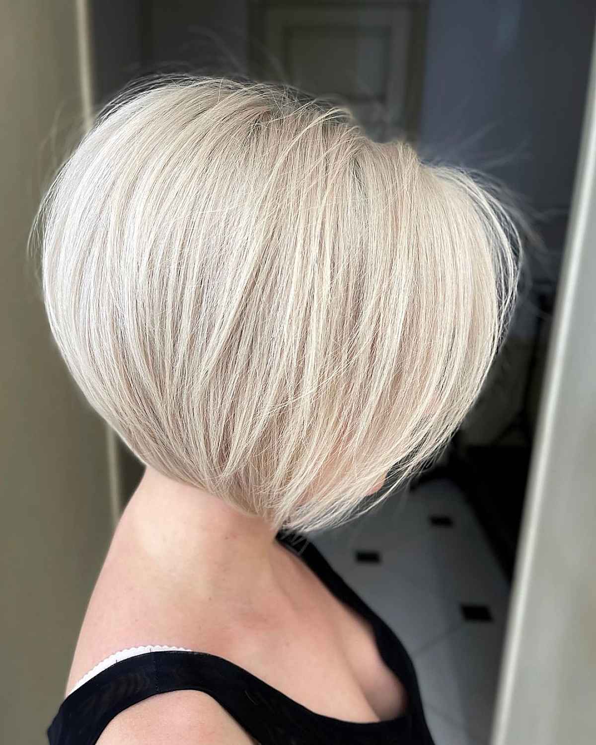 Here’s the back perspective of a chic short layered inverted bob to enhance your hair’s texture and volume! Partner this graduated bob with a dark ash blonde shade and shadow roots to elevate the illusion of dimension.