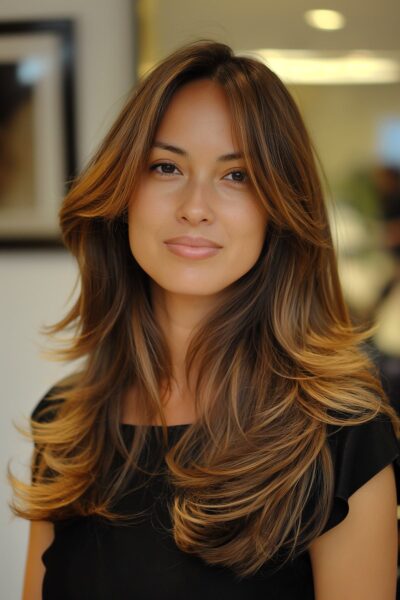 This exquisite hairstyle showcases cascading caramel tones seamlessly integrated into a medium brown base, producing a warm, inviting appearance. The layers are shaped to enhance volume and movement, elevating the natural flow of the hair. This style is ideal for medium to thick hair, delivering body and a rich texture. Though this look is adaptable for both formal and casual occasions, preserving the vibrancy of the caramel tones may necessitate occasional touch-ups and the use of color-holding hair products. It’s a lovely option for anyone aiming to introduce depth and dimension to their hair without a major overhaul.