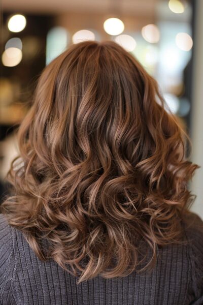 These gorgeous deep-wave curls show a natural cascading effect, perfect for those with thick, medium-length hair aiming to amplify their natural volume. The rich, dimensional color blend featuring shades of medium brown enhances the depth and movement of each curl. This hairstyle is perfect for anyone with a diamond or pear-shaped face, as the volume of the curls beautifully complements the facial structure.