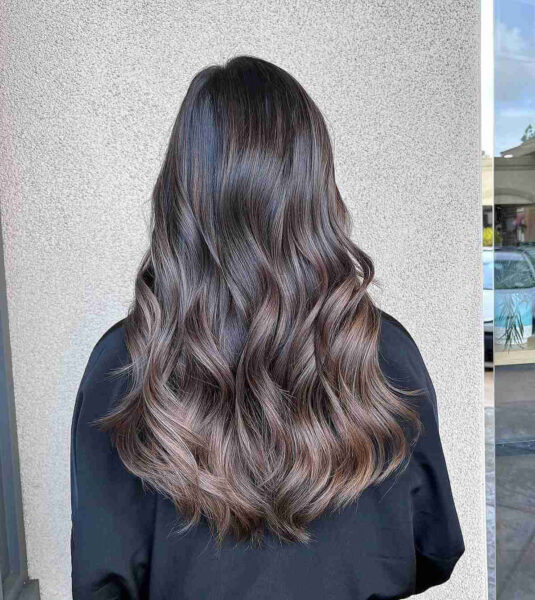 Achieve the trendy color with elegant smoky warm bronde balayage. When you start with dark natural hair, balayage will often feature a mix of warm tones. An ash toner will help to neutralize and soften your color for a smoky and muted hue. Consult your stylist about ash brown shades and determine if they suit your hair.