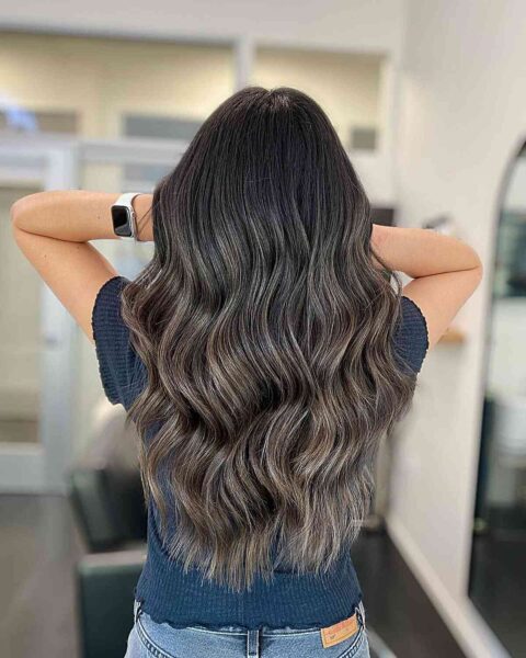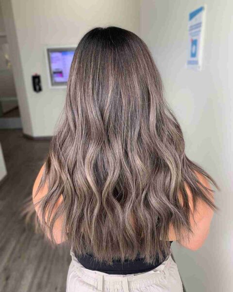 These dimensional and contrasted grey-brown balayage babylights look stunning on beachy waves! Embracing this smokey ash brown shade is a fantastic way to rejuvenate and enliven your naturally dark mane.