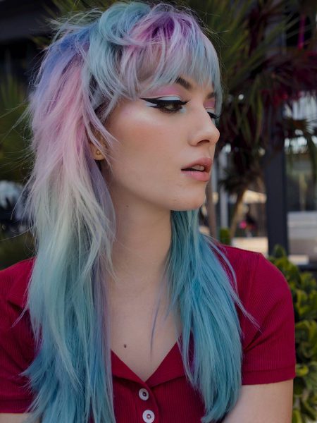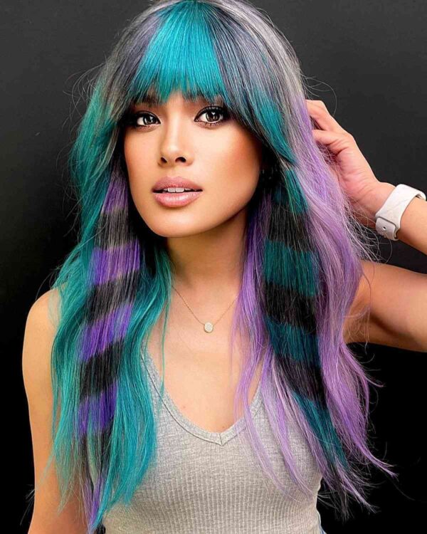 When opting for a fantasy hue, selecting a color scheme that harmonizes with one another can be beneficial. I suggest cooler shades that will blend beautifully in your hair for a more delicate appearance and gradual fade. Incorporating the color with a striking curtain fringe will capture everyone’s attention.