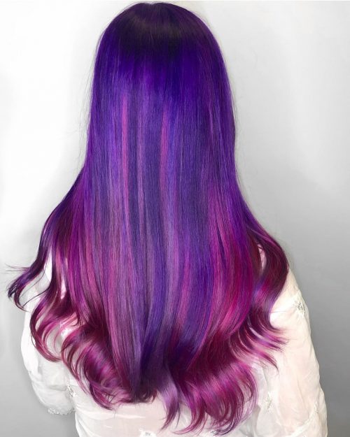 This shade of purple hair ventures into the adventurous side, transitioning from a sun-kissed balayage to a dazzling unicorn.