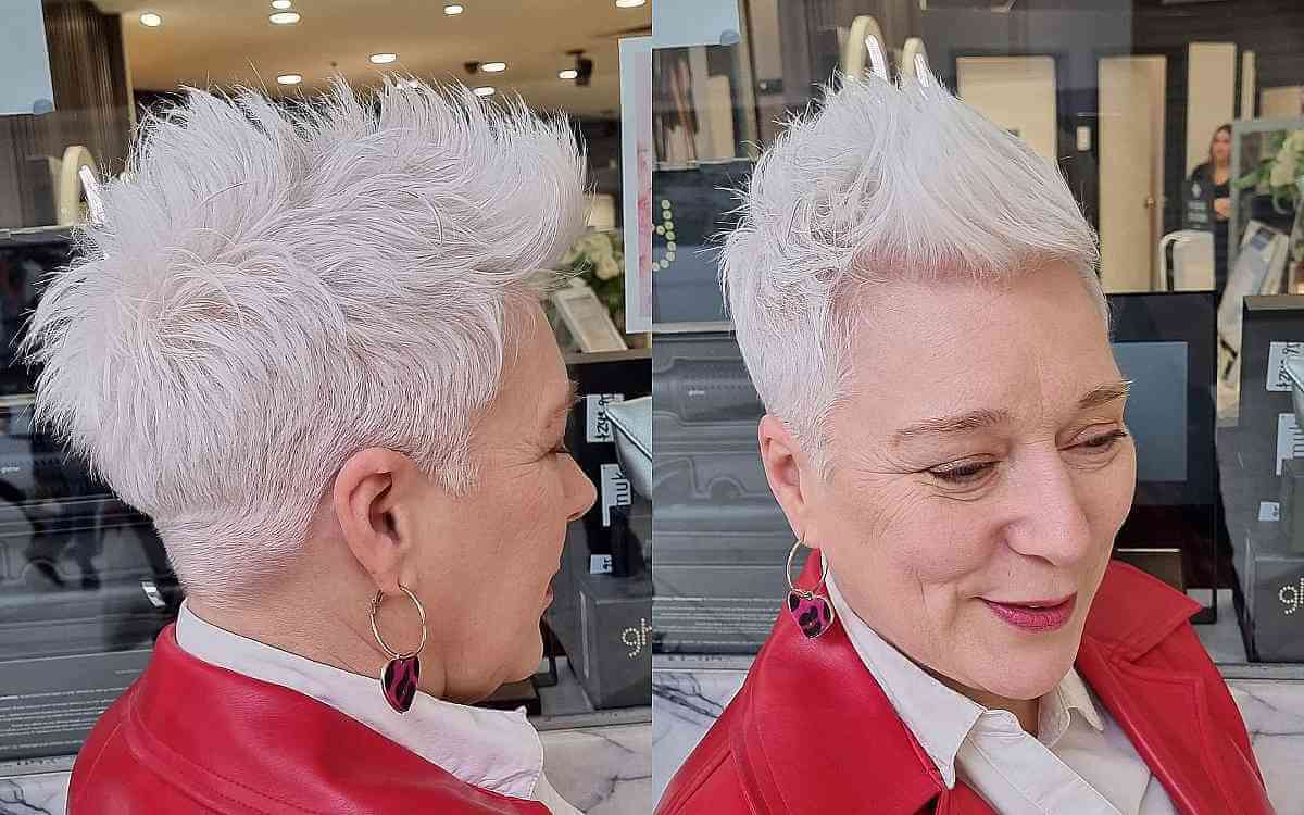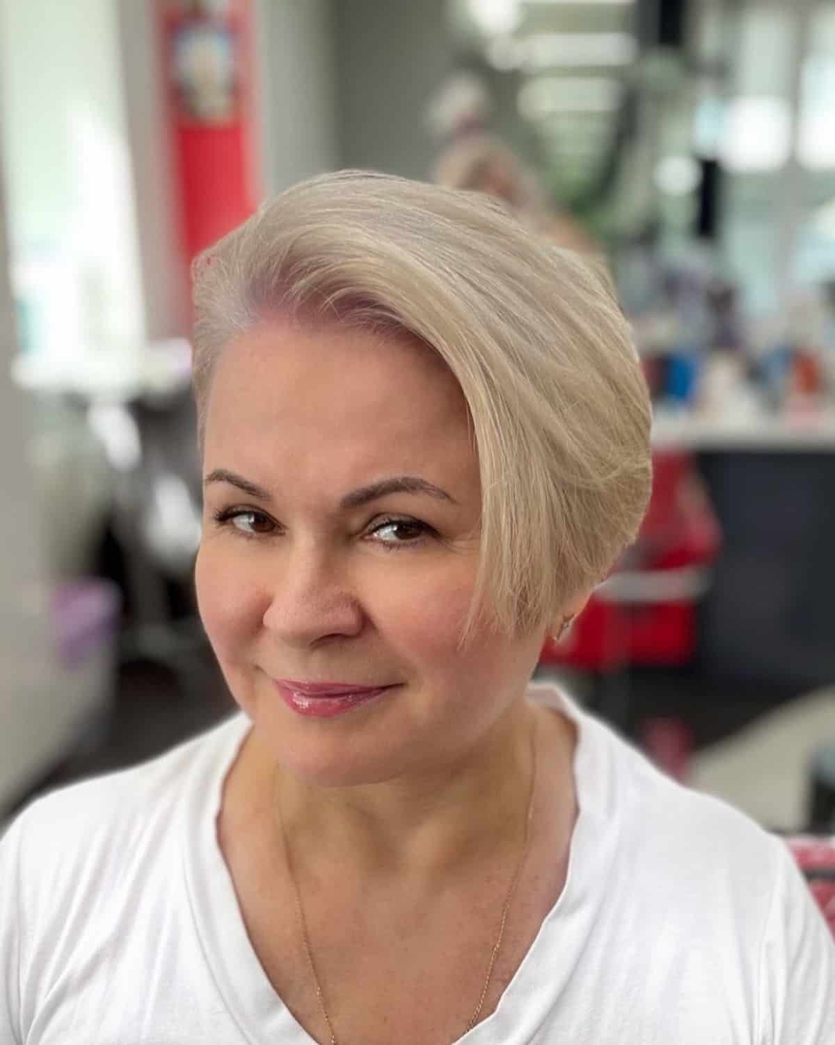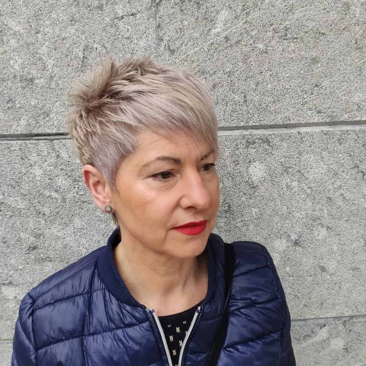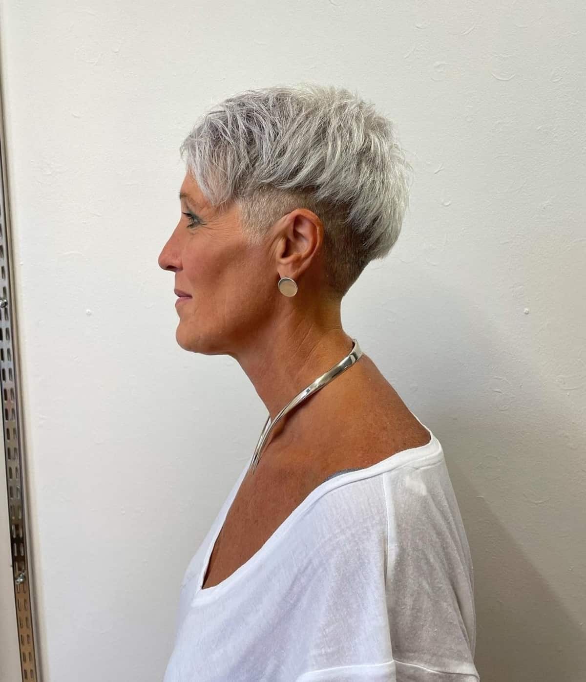 Choose a hairstyle for women aged 60 and above to highlight the eyes. The cut is short around the sides and back, leaving the silver hair longer to frame the cheekbones and eyes. Do a soft point cutting to avoid any heaviness. Consider pixies for women in their 60s at your next salon appointment!