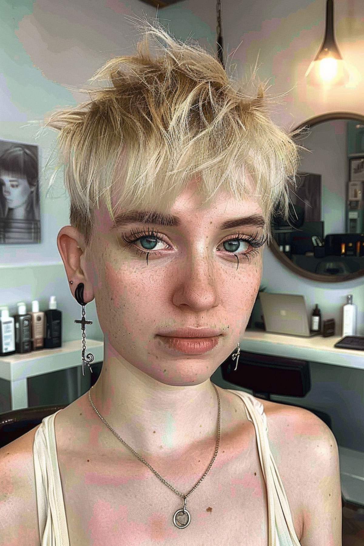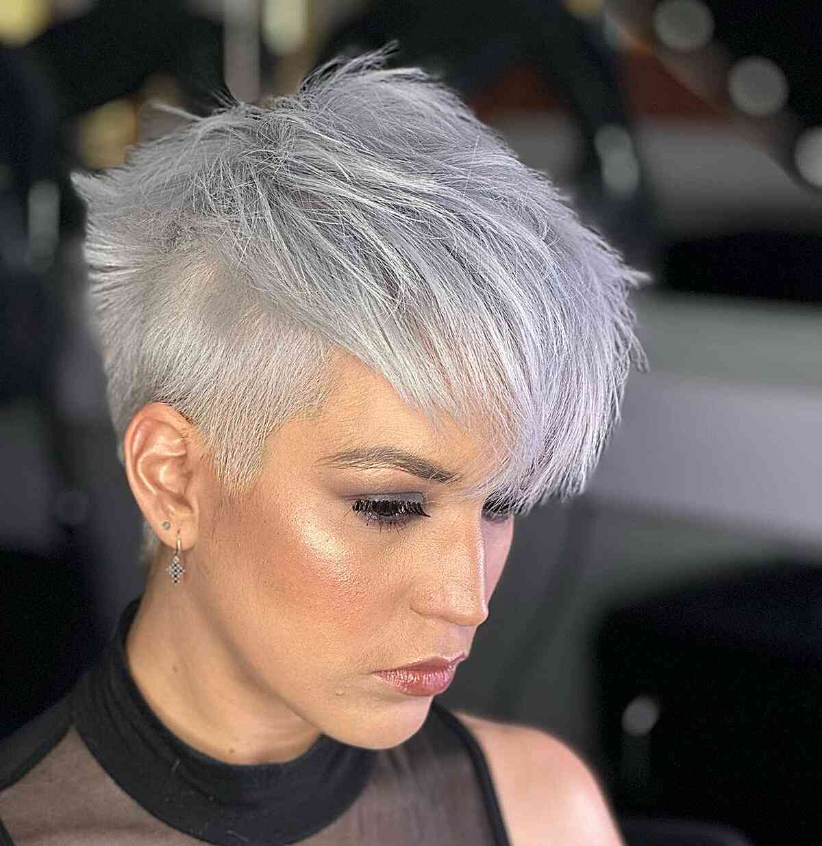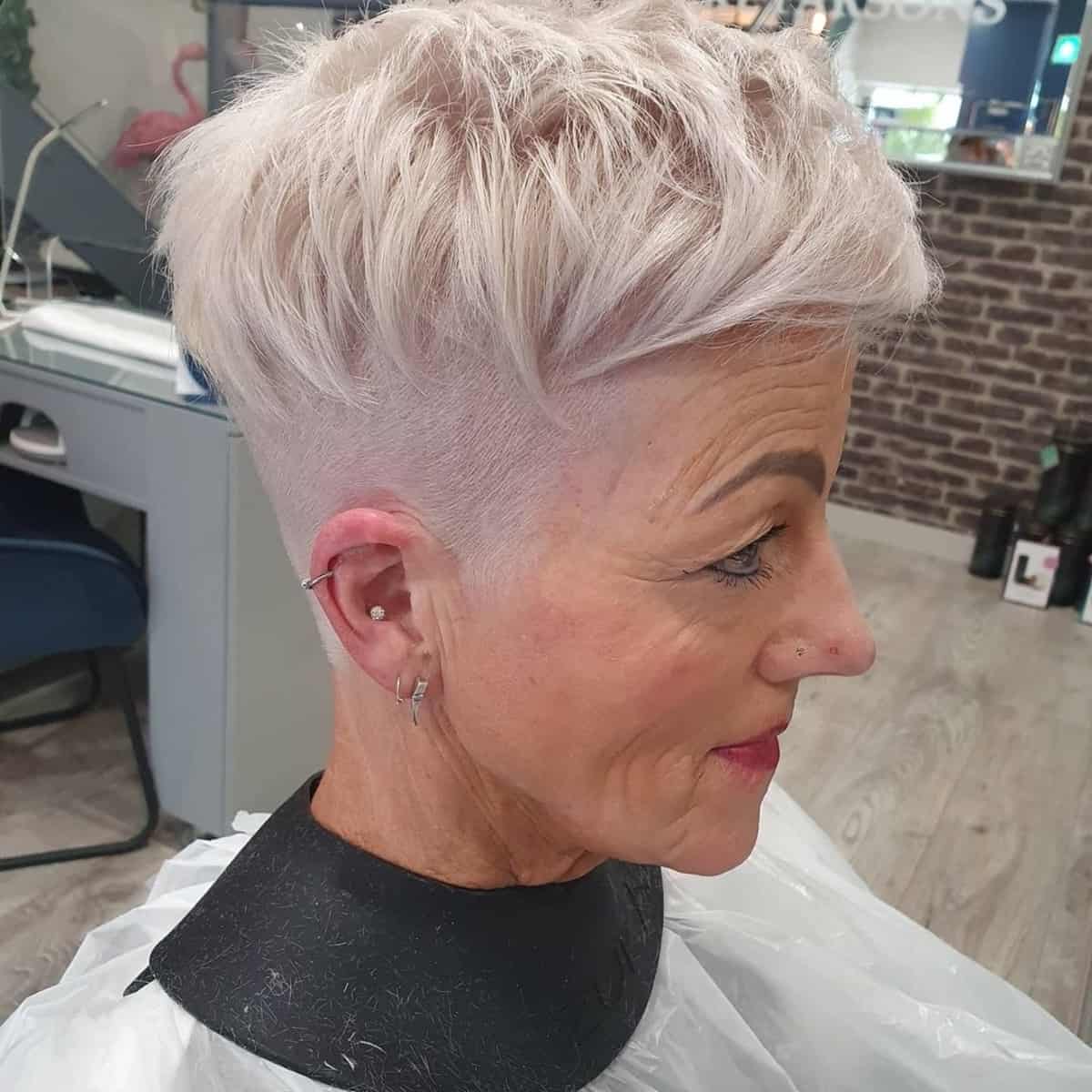 A tapered pixie cut for women aged 30 and above provides a youthful, edgy appearance while keeping a mature, sophisticated vibe. Pixies for women in their thirties feature sleek, shaved sides combined with an almost faux-hawk top and a platinum blonde hair color.