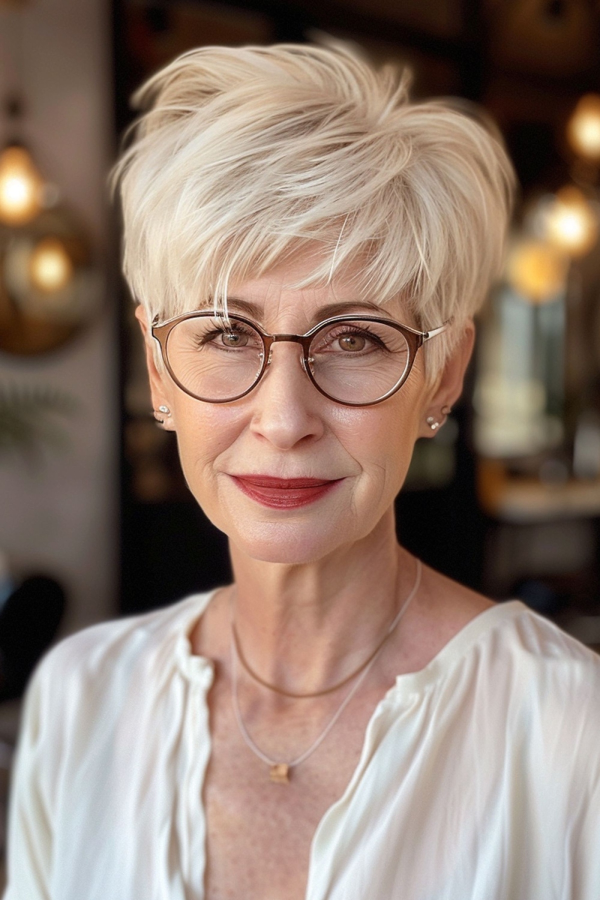 Chic Textured Pixie Cut for Mature Women Who Wear Glasses