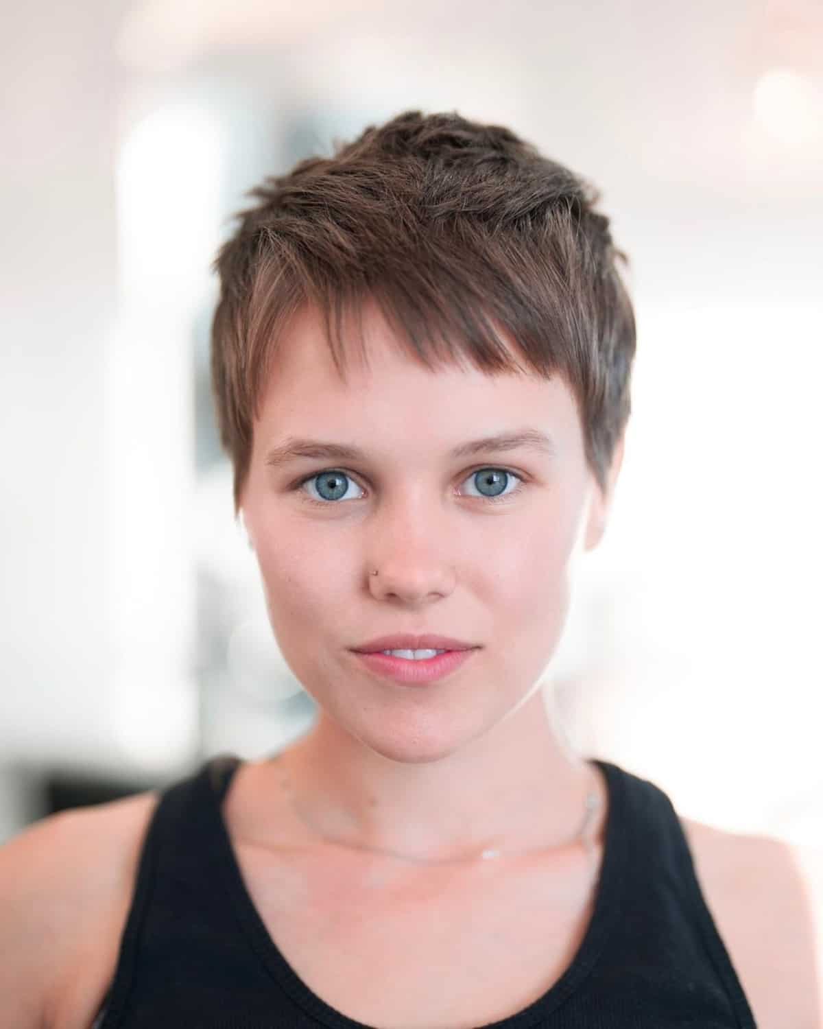 To achieve an effortless pixie cut for bold females, ask your hairstylist for very short, choppy sides and long face-framing fringe. To avoid the blunt fringe look in your style, you may need extra texture or thinning at the ends.