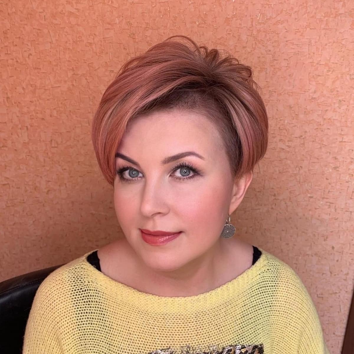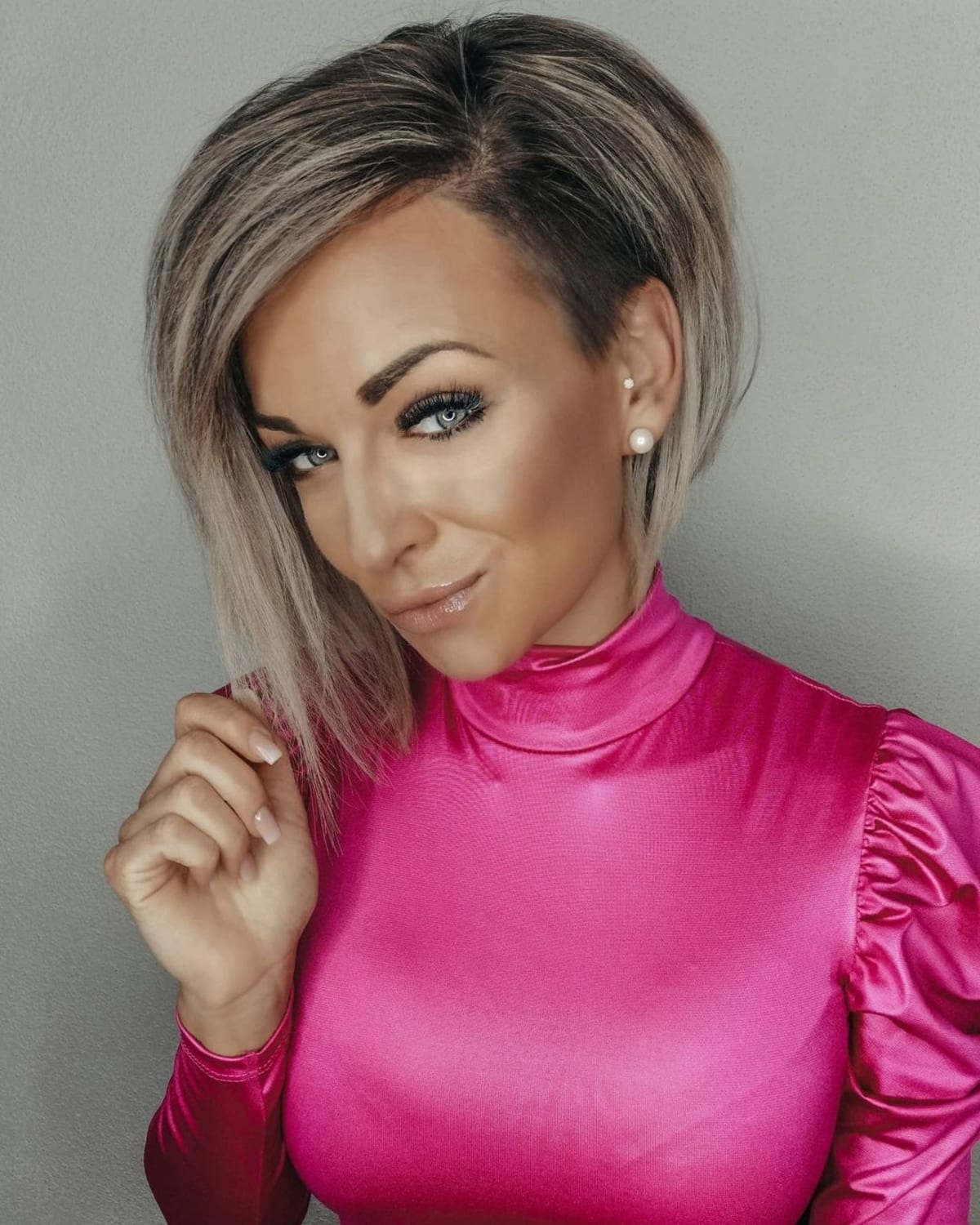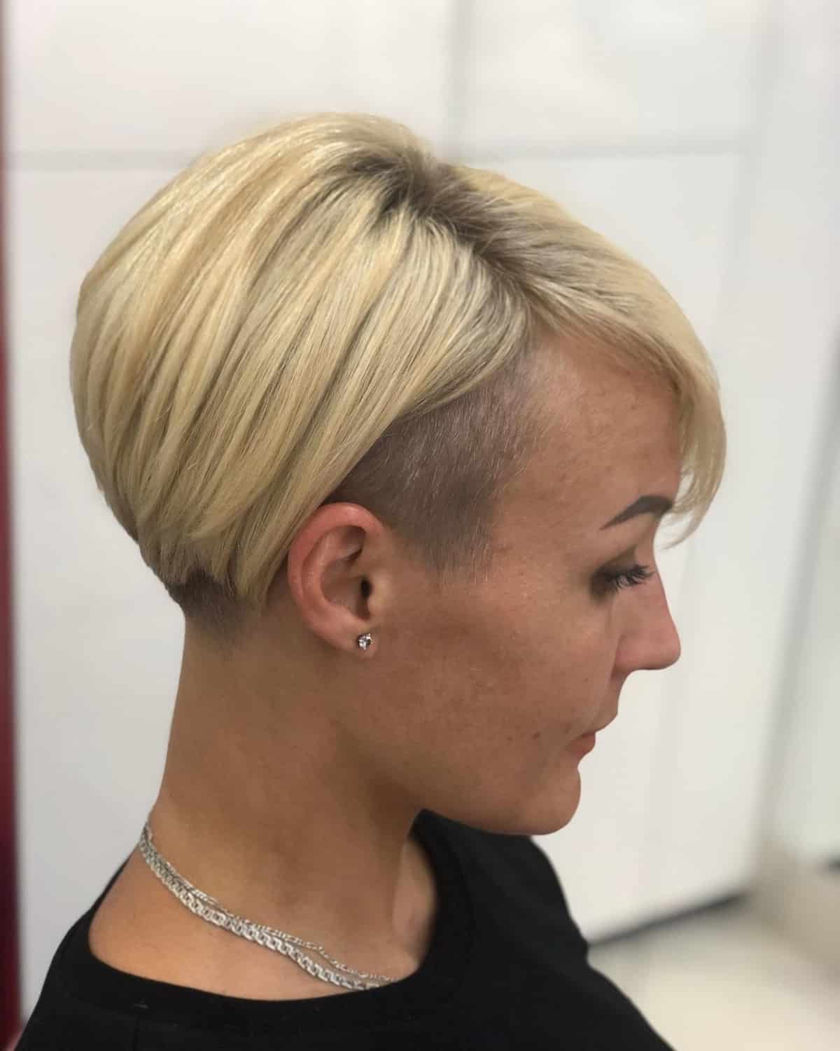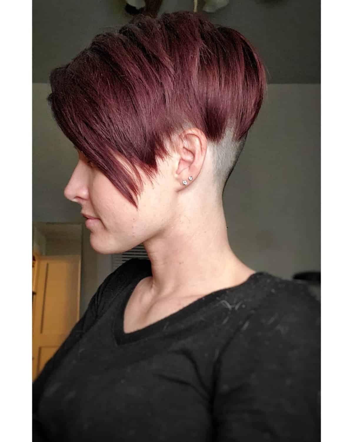 Short hairstyles with shaved sides offer a playful approach. These haircuts can be styled tucked to showcase the bob with shaved undercut or worn straight down to conceal it. Just ensure the top lengths are long enough to cover your buzz cut. The shaved sides will grow out quickly, necessitating a trim every 3 weeks. Consider adding a splash of color on the longer sections to elevate the look.
