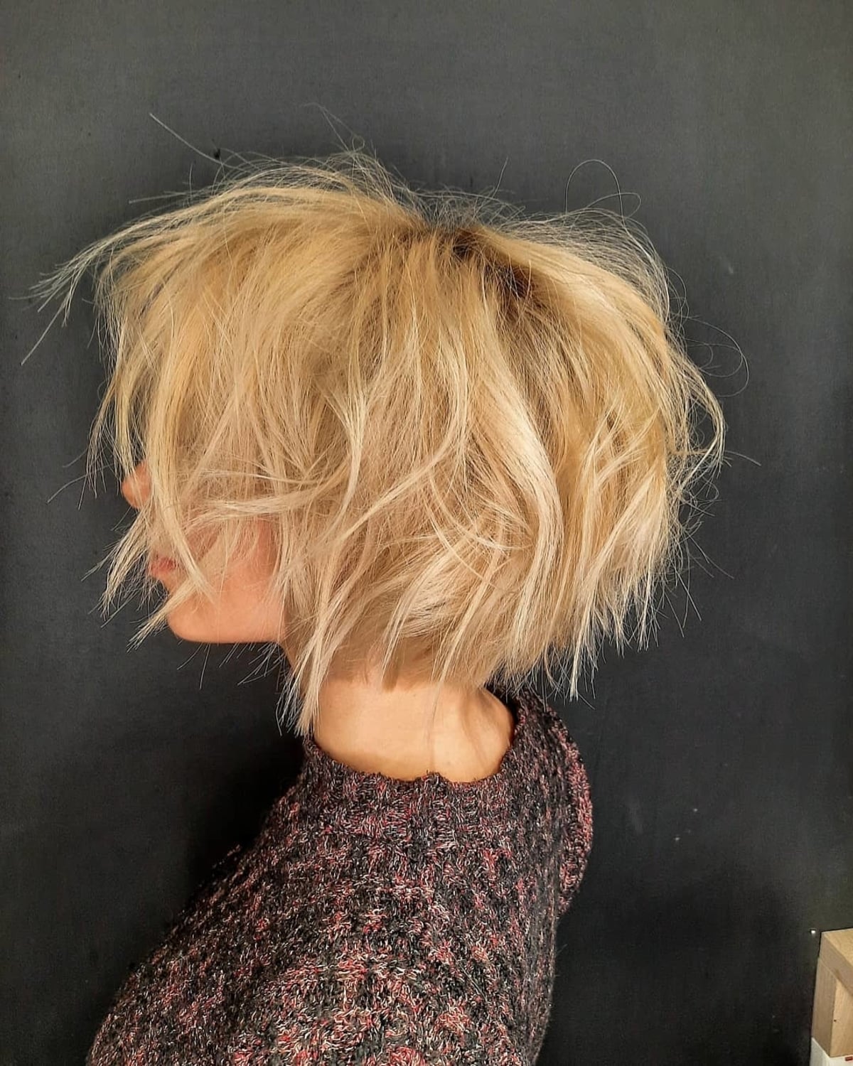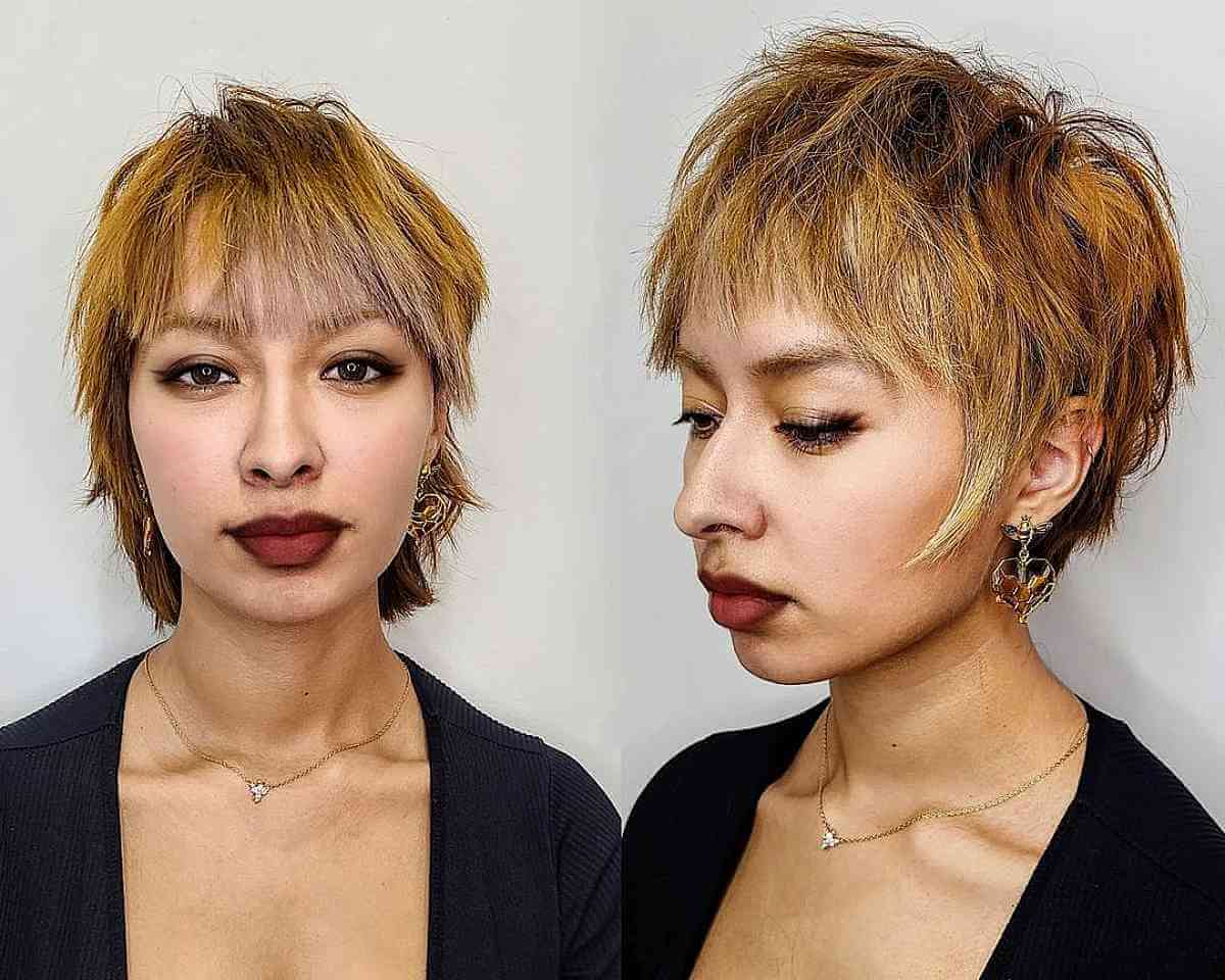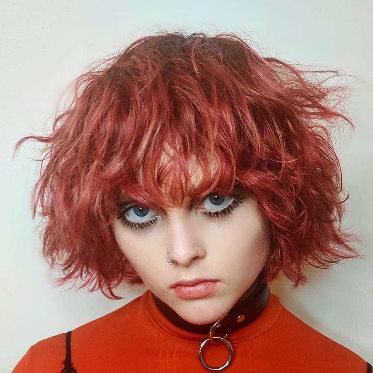 This short, punk rock shag hairstyle features intense layers, textured choppiness, and a generous amount of volume. It’s an ideal cut for fine hair, especially if you aim to embrace your punk flair!