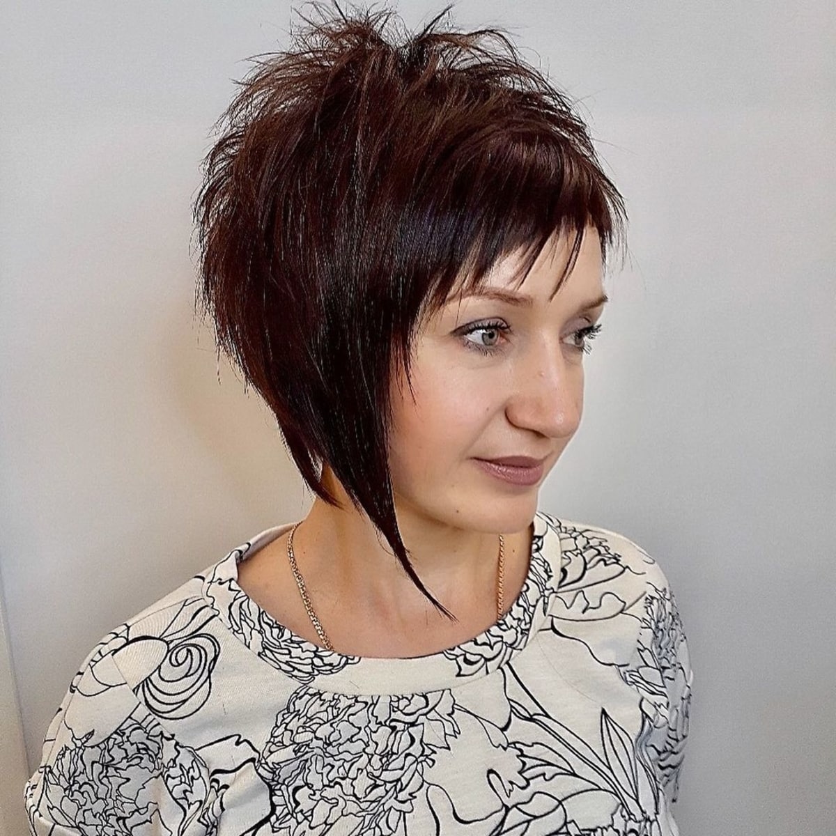 An uneven pixie haircut with lightened strands is the ideal selection for women over 40. The asymmetry in the front hangs over the face to soften your features. The lighter strands can help conceal grey hair and root growth.