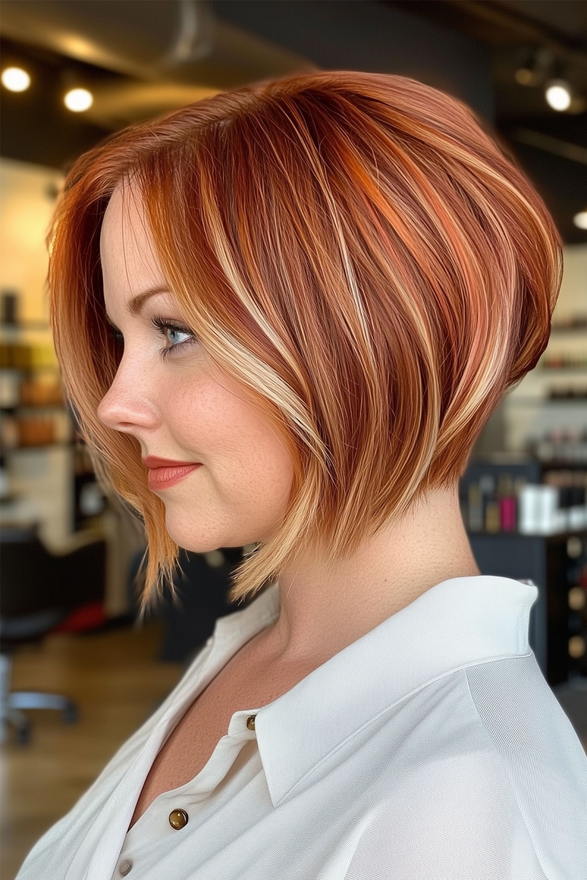 A contemporary inverted bob with bold hues adds a striking flair to the classic bob style. Long face-framing sections and a fuller, more voluminous shape at the back create a stunning, more flattering appearance without the additional heaviness.