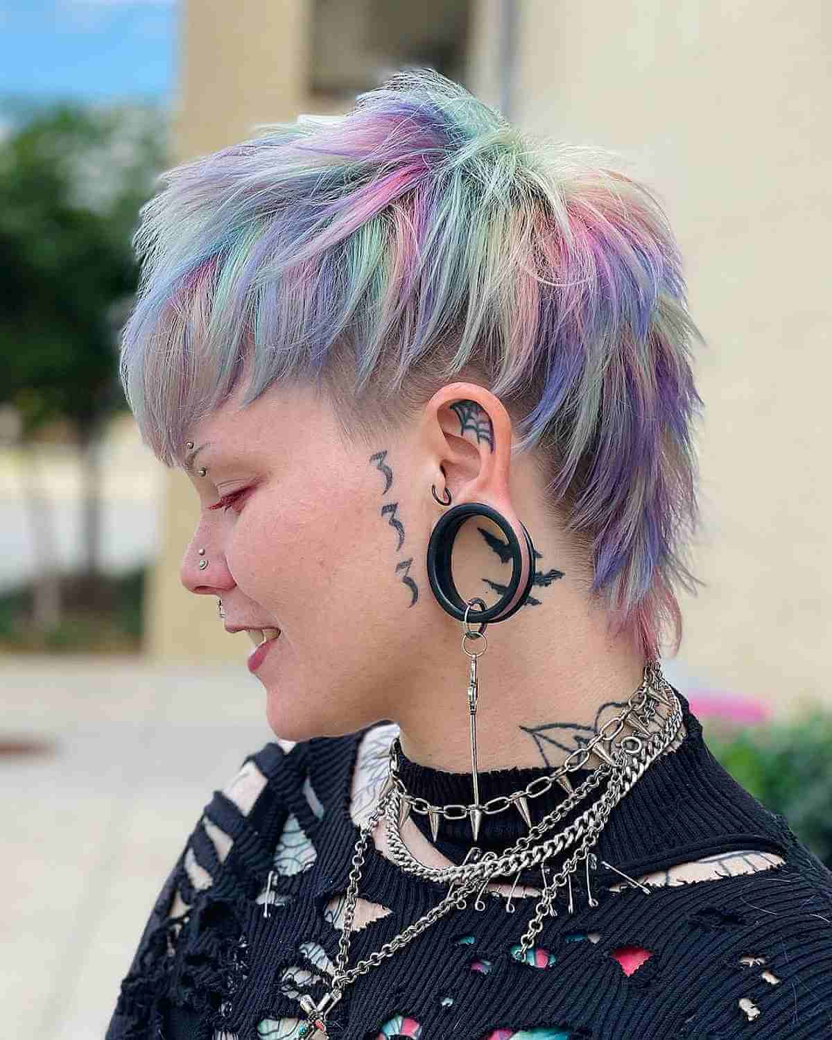 A mohawk featuring a pastel rainbow hair color is a stylish cut and color combination that showcases your unique personality.