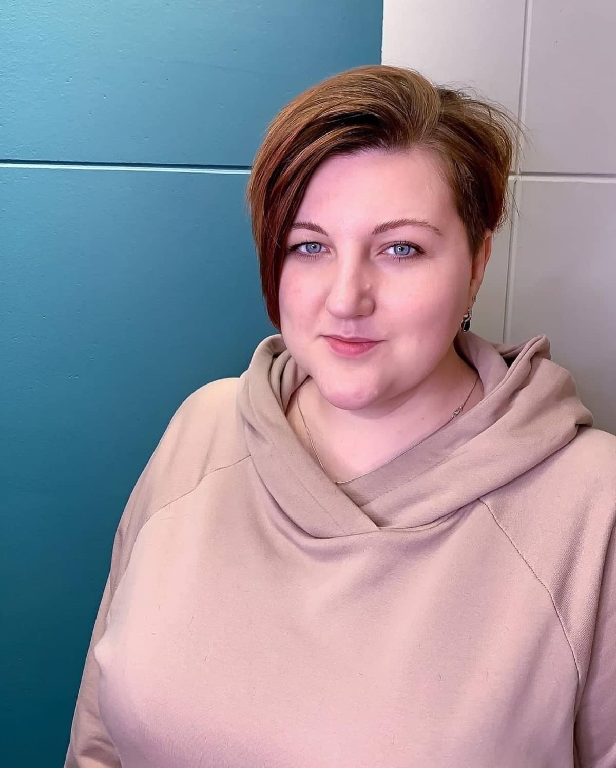 Explore a chic very short pixie cut for a round face as your next look. A short haircut is easy to style with a pomade that requires minimal dry time. A hint of makeup is essential in softening the boldness of this short yet beautiful silhouette.