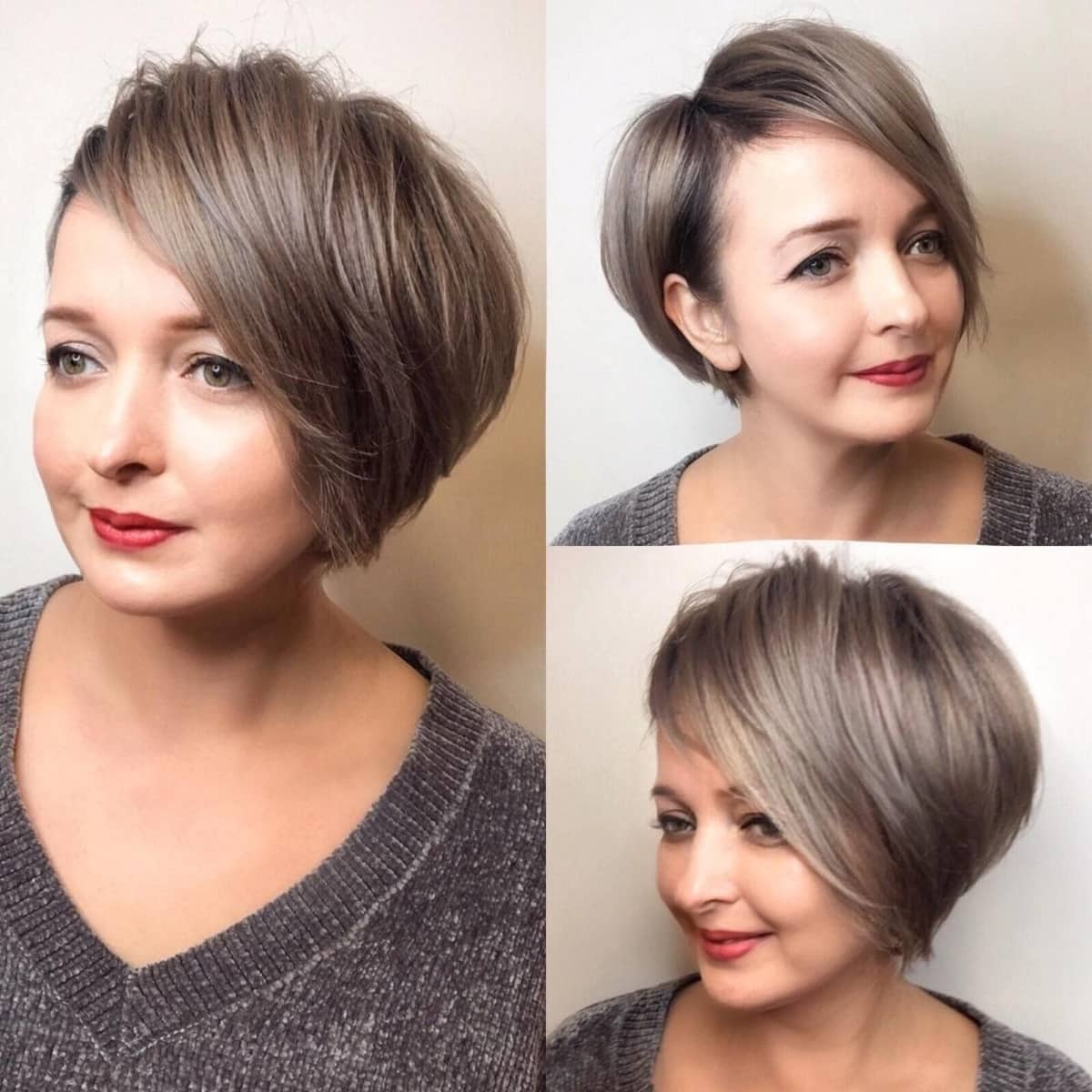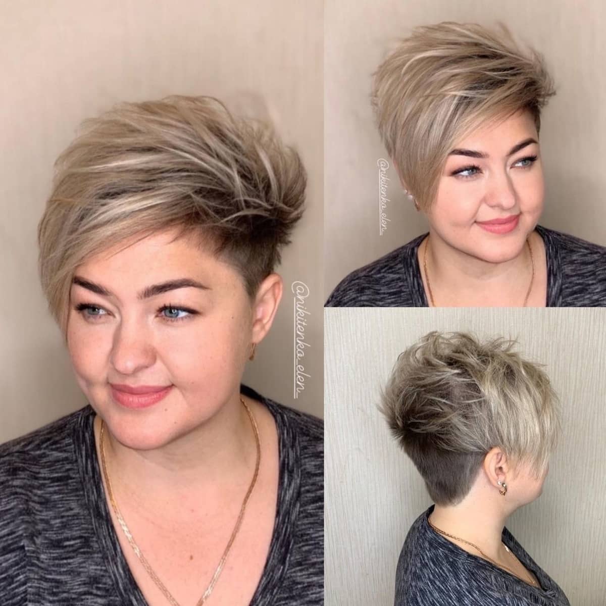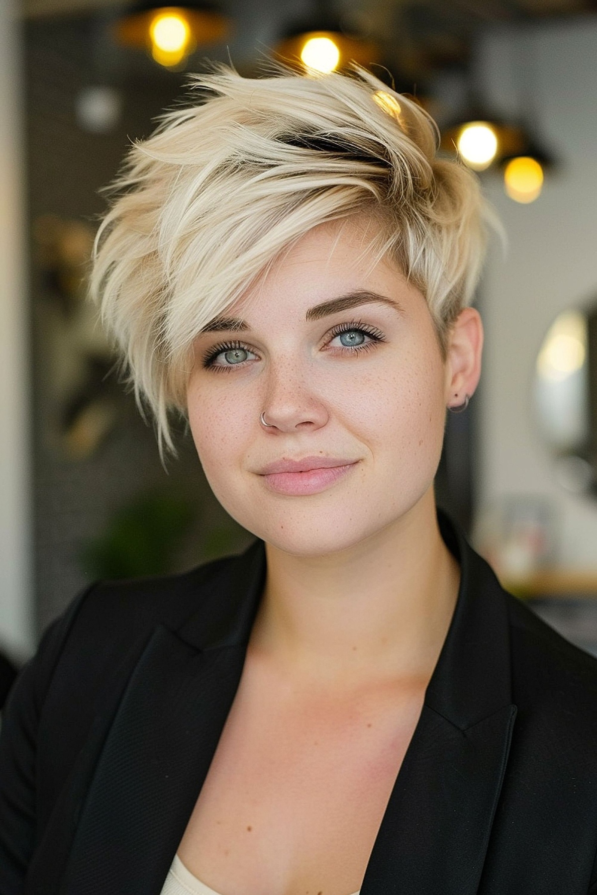 A chic blonde bixie with side-swept bangs may be just the transformation you need to radiate confidence! This hairstyle has helped create the illusion of a slimmer round face by maintaining length at the bottom while adding height with some layered pixie cuts. Transitioning from brunette to blonde can elevate your look from ordinary to extraordinary!