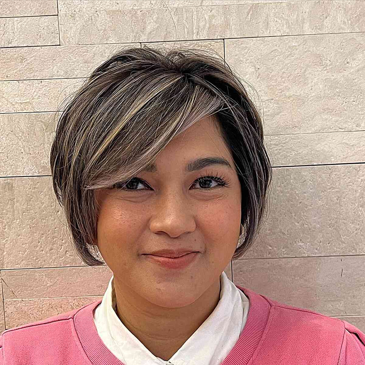 A pixie hairstyle for Asian women looks gorgeous with wispy, side-swept bangs. Long side-swept bangs and layers of different lengths offer extra volume. It also allows the balanced combination of length and height, giving the illusion of an elongated face shape.