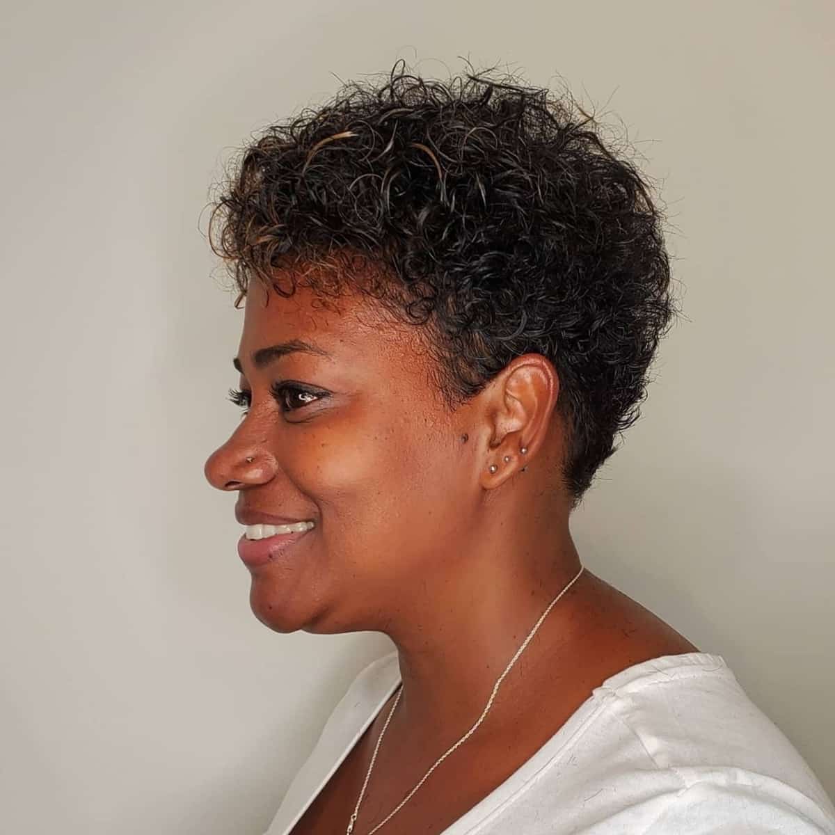 A chic curly pixie hairstyle is perfect for women of every age seeking a stylish look that’s simple to care for. These pixie cuts help to create a slender appearance for prominent jaws, enhancing the overall face shape.