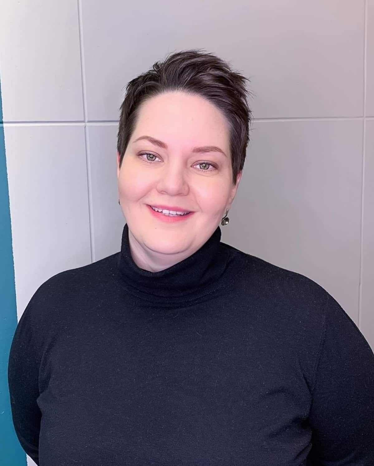 The ideal pixie cut for round face shapes helps create the illusion of a slimmer facial outline. It’s shorter at the perimeter of the temples and nape, allowing for a longer length on top. The added volume on top extends the face while resembling an oval shape.