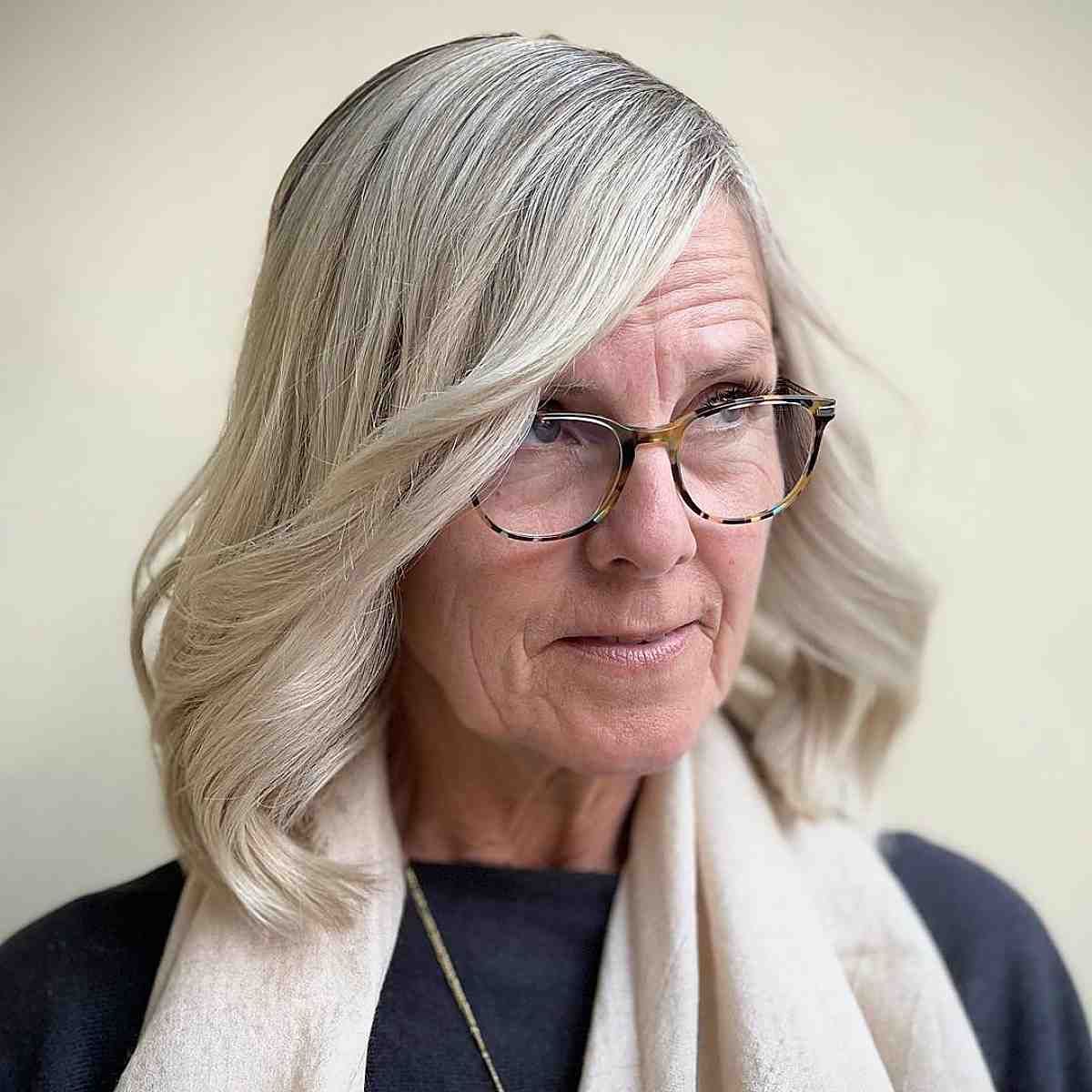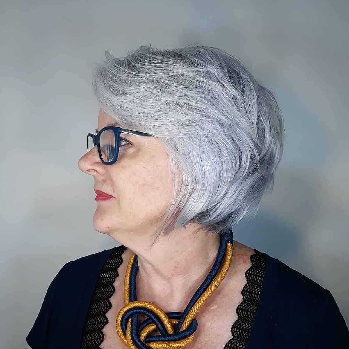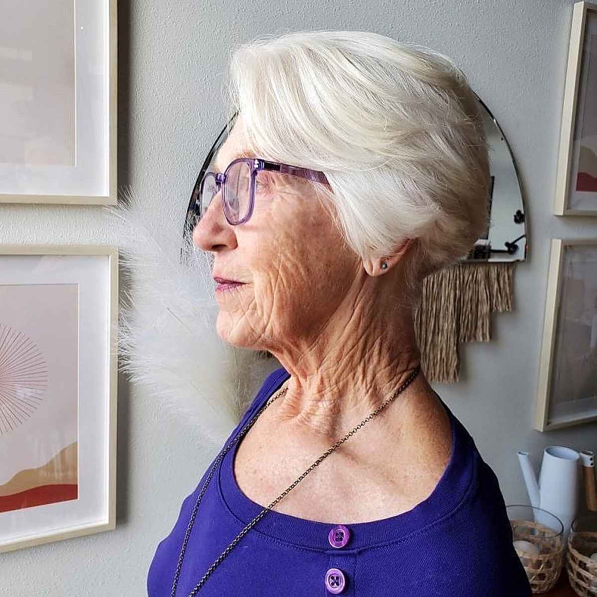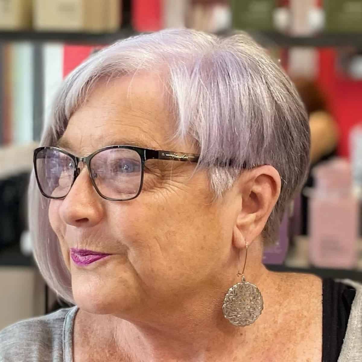 Inquire about an adorable short and messy hairstyle featuring a natural hue. For women in their 70s with glasses, a hairstyle that is simple to care for and keeps away from your eyes is essential. Style your hair swept to the side to ensure it remains out of your face, and consider an asymmetrical bang for a gentle effect around the eyes.