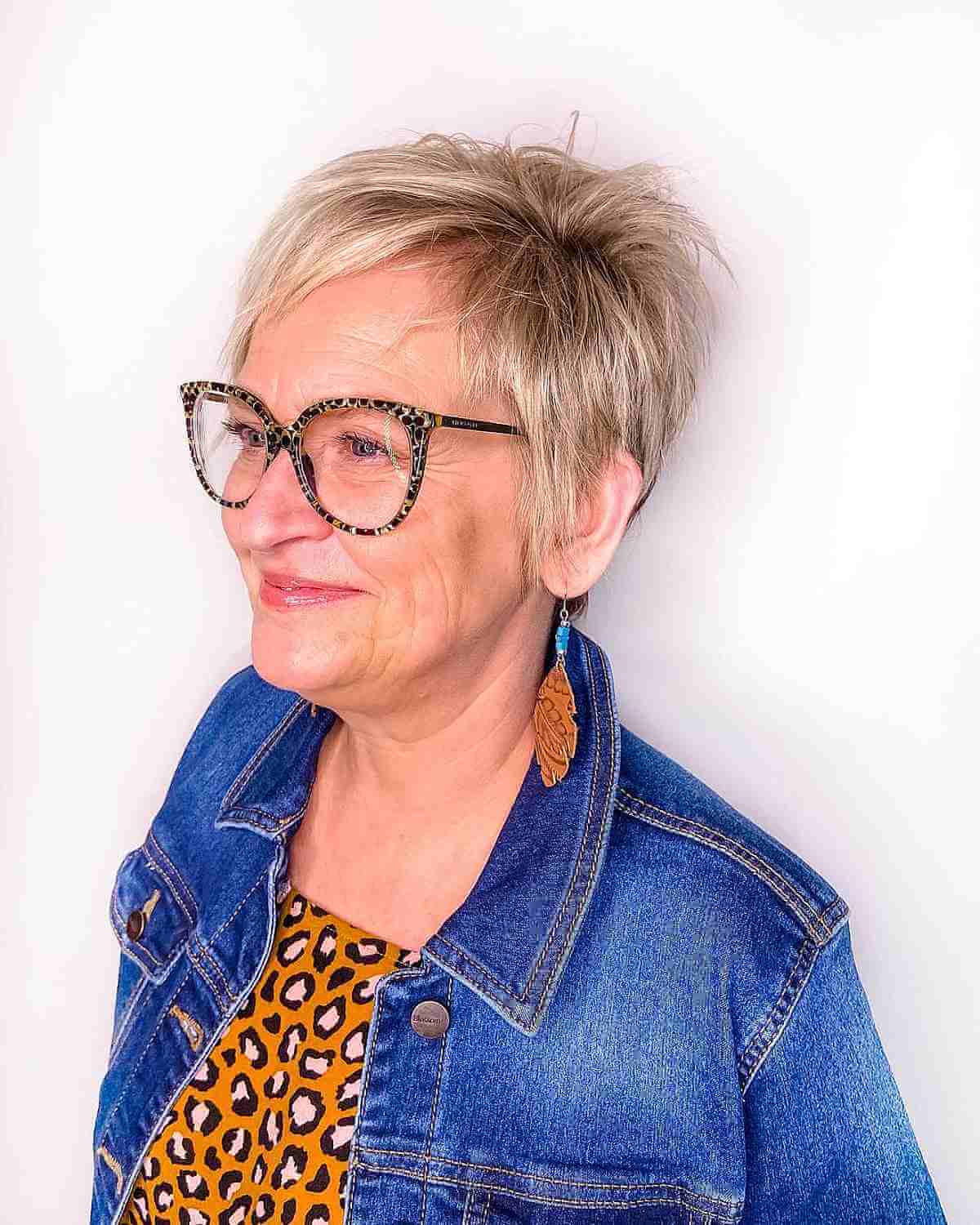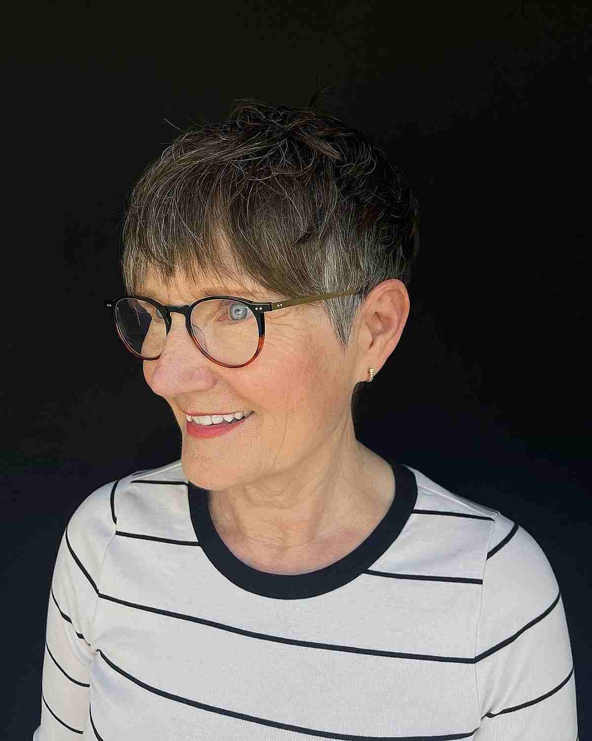 A feathered pixie cut for mature women with eyeglasses is a soft style with more length than the traditional pixie haircut. Leaving hair on the tips of the ears and a bit of length at the back will give you a youthful, feminine glow. Shorter bangs look stylish and complement rectangular face shapes. A feather razor is used to cut your hair and give your hair an added layer of texture.