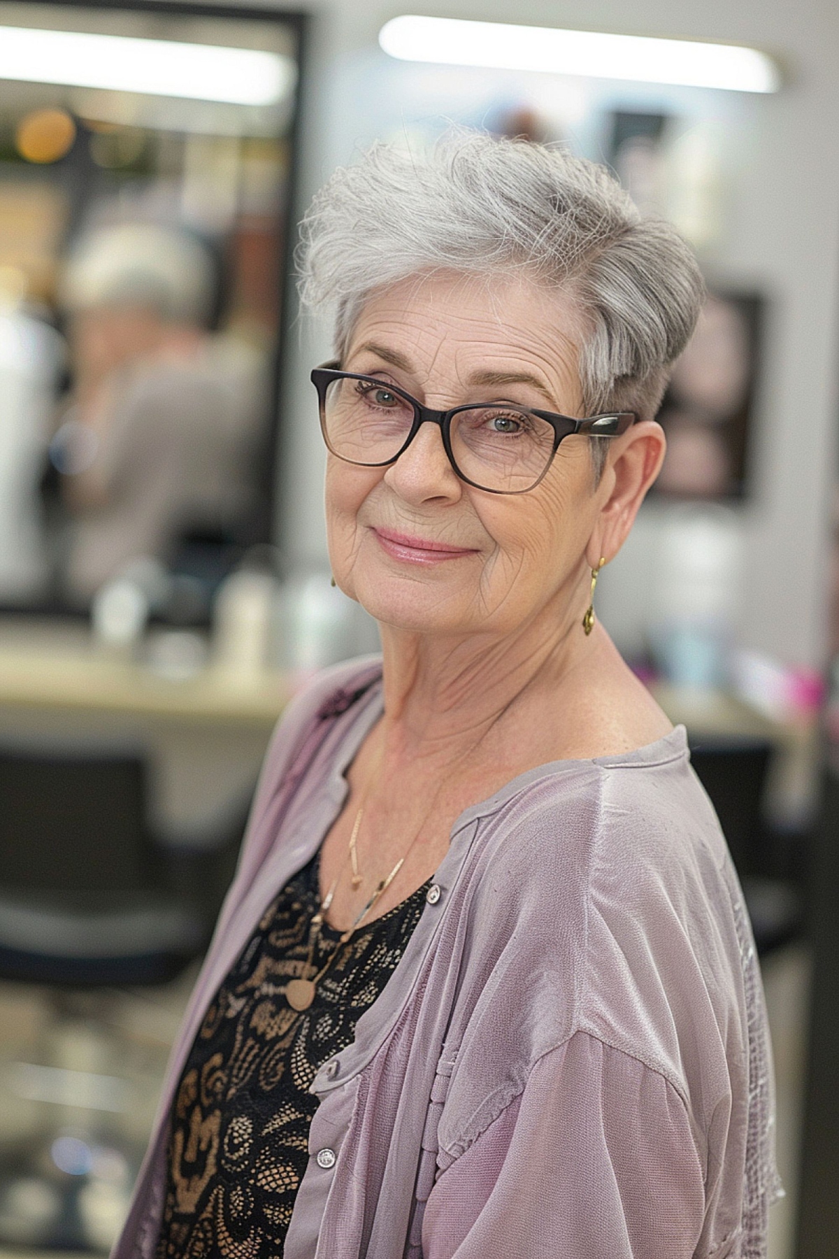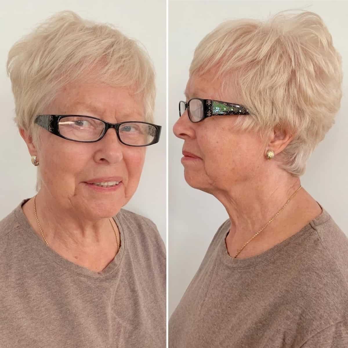 A chic very short pixie for ladies in their 70s can take years off your appearance. A long hairstyle can drag your face shape down, and short hair can give your appearance a lift. As a bonus, short hair is quick and easy to style. Ask your hairstylist to cut your hair short but leave some length on top for the illusion of added volume. It benefits women who have eye wear and will look best when the hair is pushed off the forehead.
