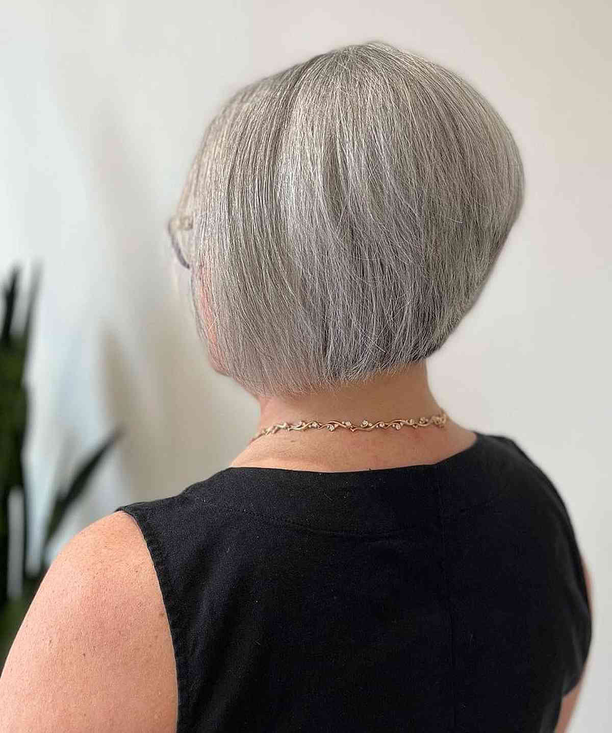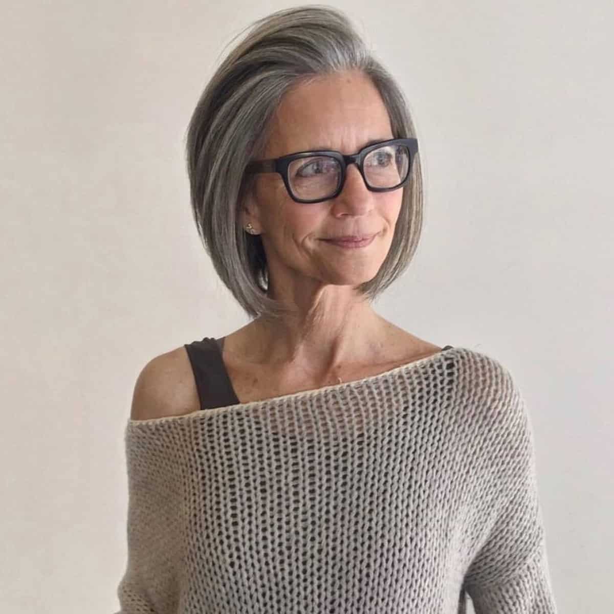 A stylish grey-haired bob is an elegant choice for mature women who wear glasses. A timeless cut, it looks best smooth and uncomplicated and is suitable for any hair type. To achieve this look, mousse, a round brush, and blow-drying are all you need.