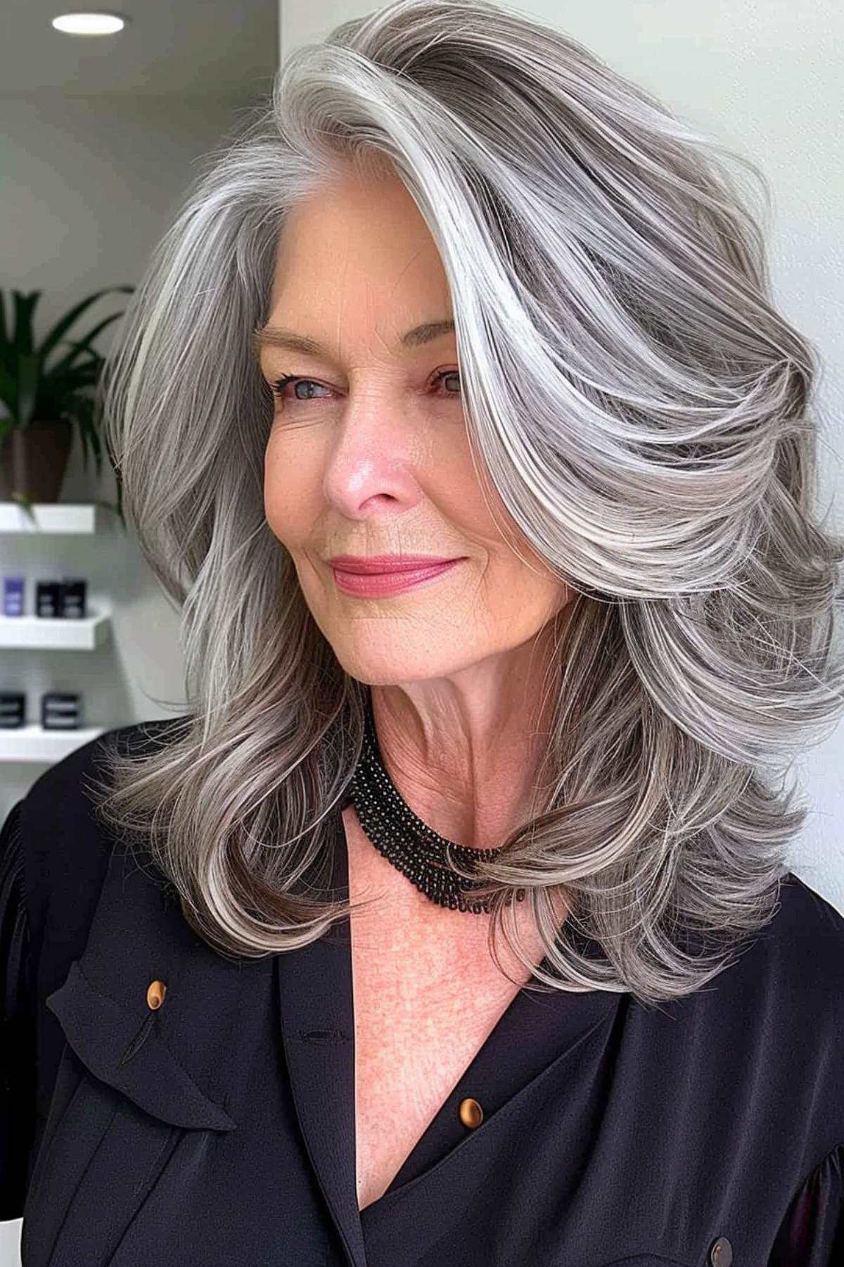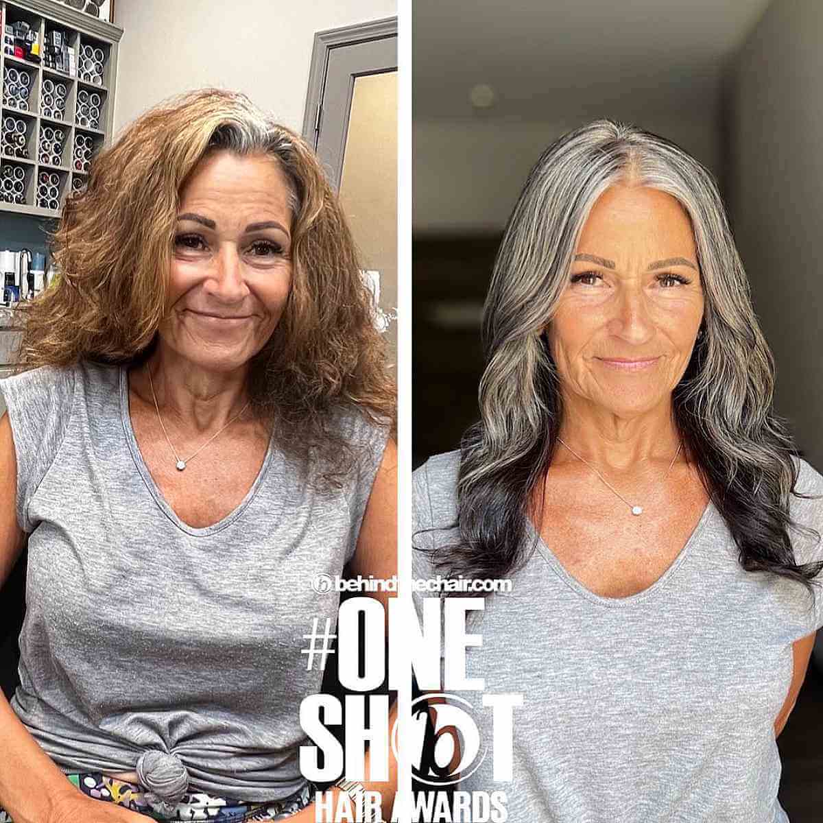 A chic black and silver balayage for senior ladies will seamlessly blend grays with highlights and lowlights for stunning contrast. The key is to incorporate lowlights into your long hair that will harmonize with your natural hair color. Consult the colorist for a technique that will best achieve this look.