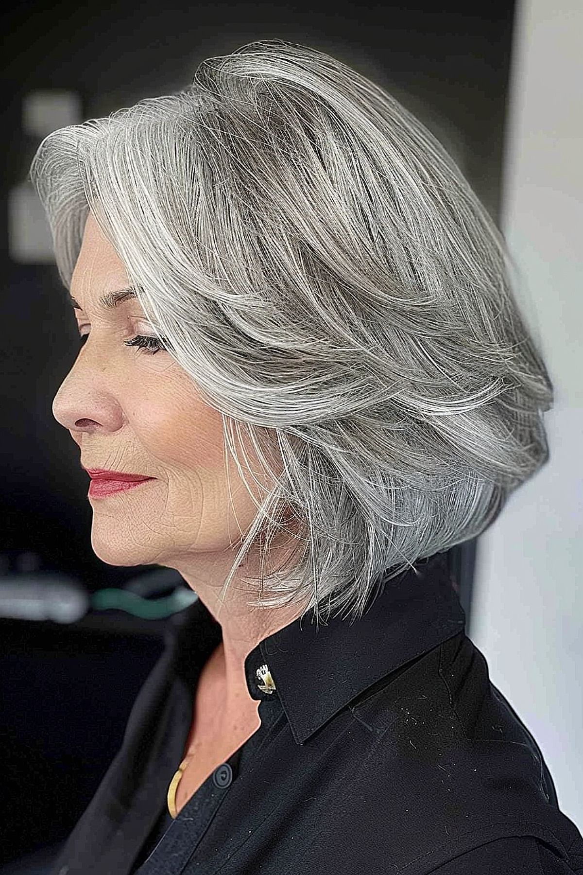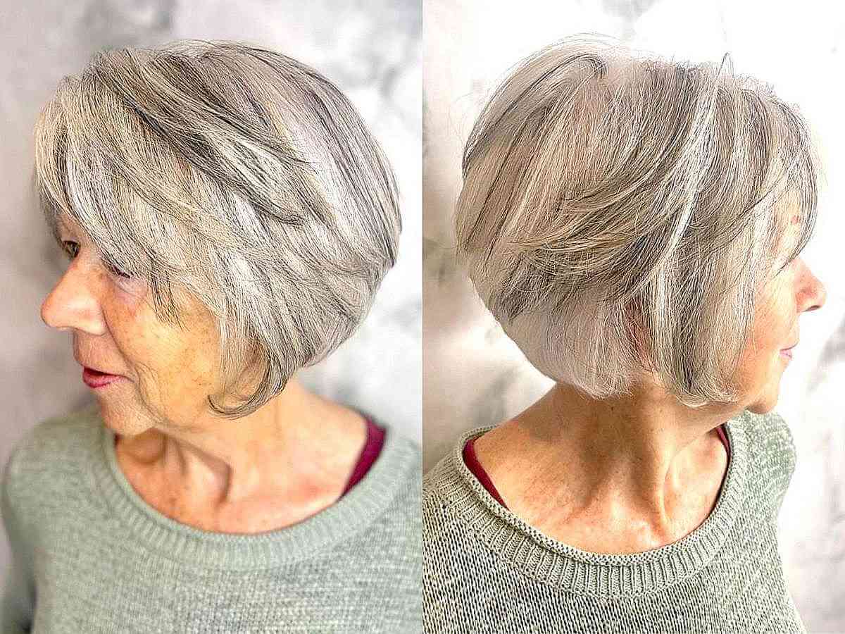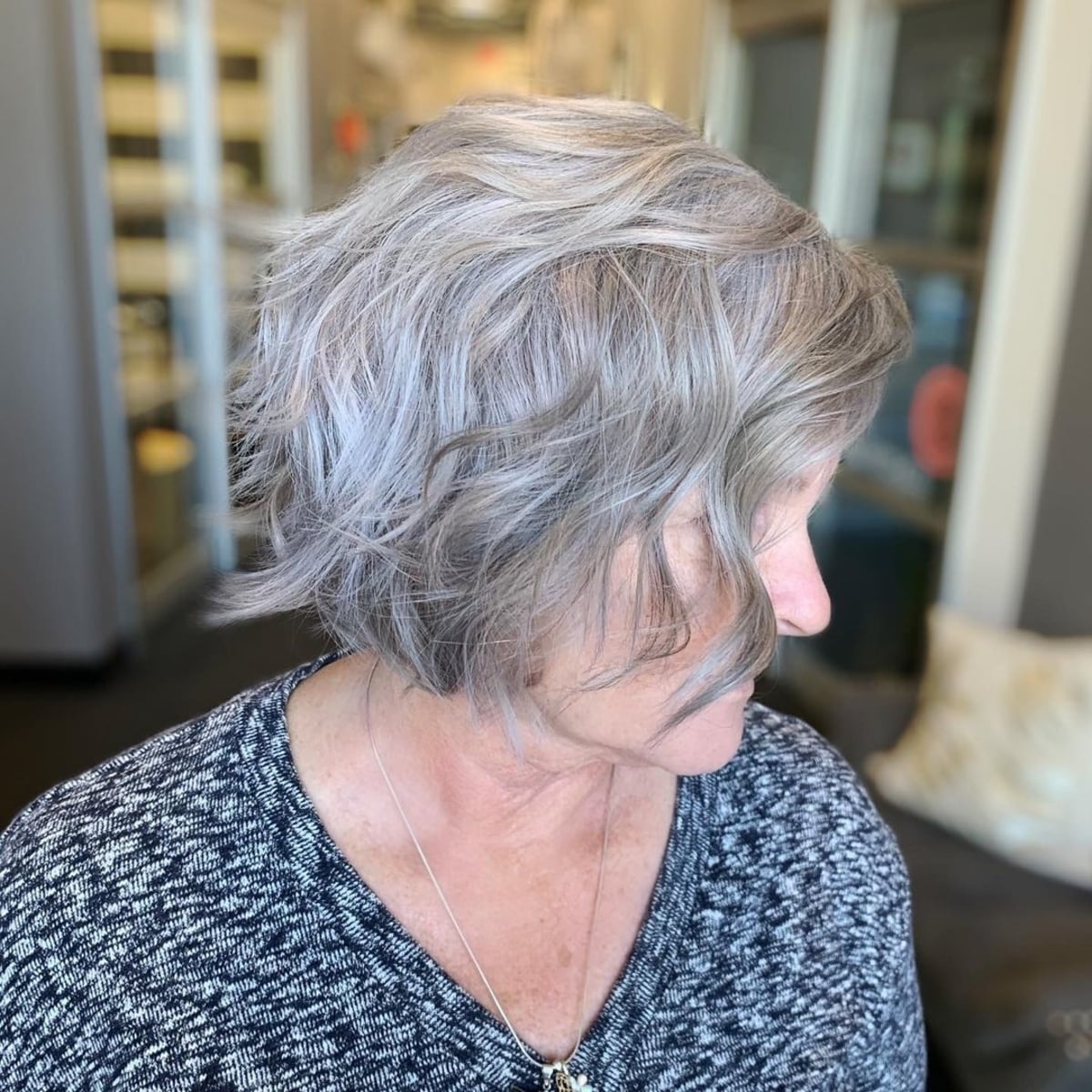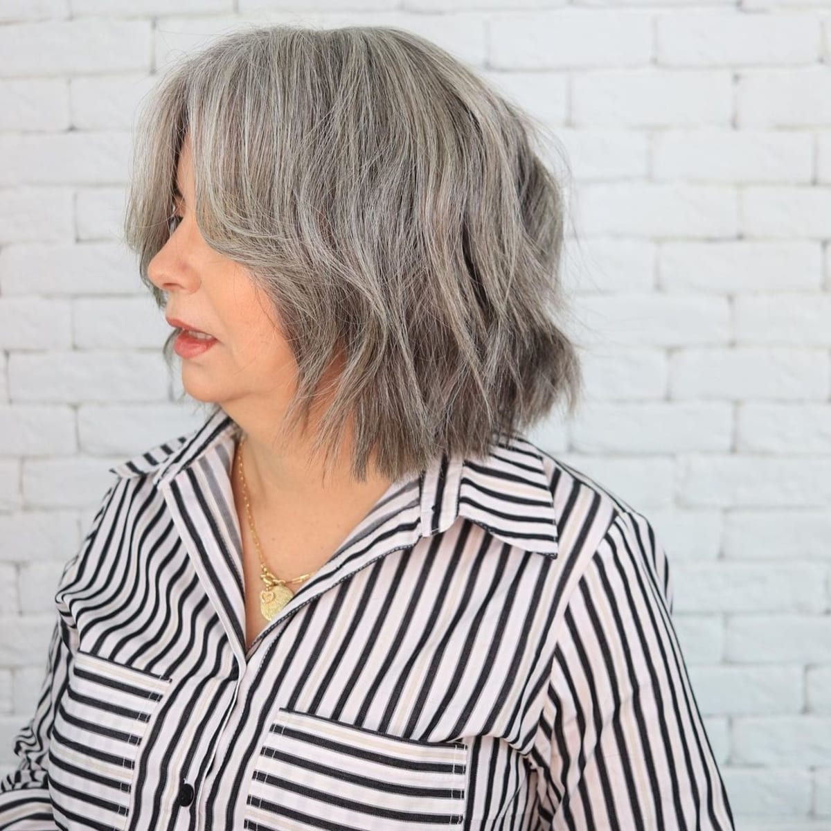 An airy grey bob is an ashy-colored haircut with a lot of movement. Bobs are a very stylish look that all mature women can embrace. It can be tailored for thin, medium, or thick hair.