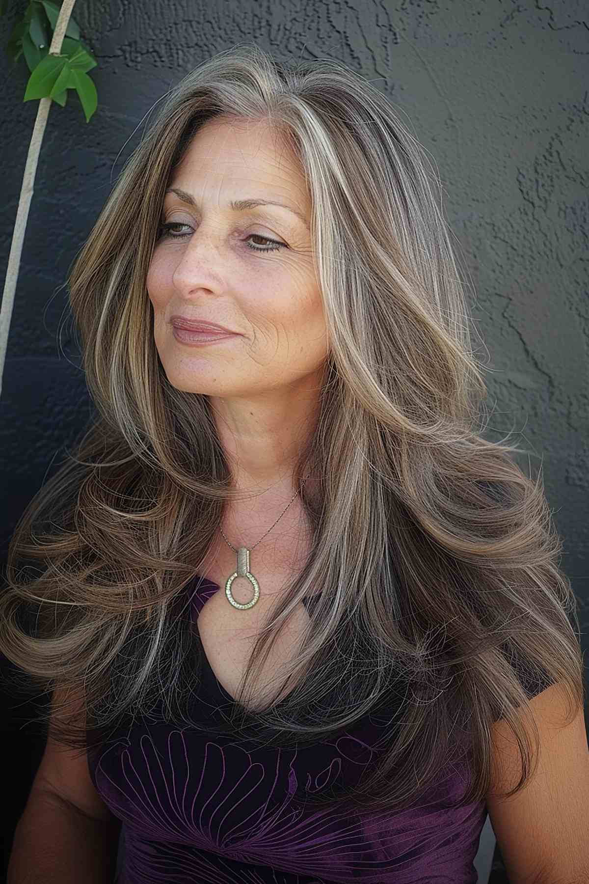 This striking long layered hairstyle showcases a harmonious mix of brown and grey shades, ideal for those celebrating their natural grey while infusing warmth. The layers provide movement and volume, making this look perfect for medium to thick hair. It’s a low-maintenance style that accentuates your hair’s natural wave, providing a graceful transition to more grey coverage. Although this look is beautiful and simple to manage daily, regular salon appointments are needed to maintain the color’s seamless appearance.
