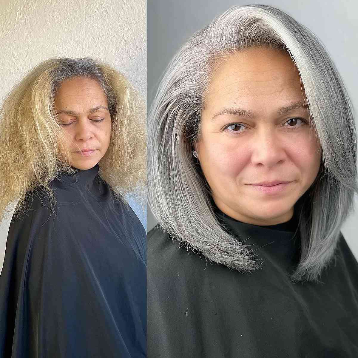 Revitalize your hair to its natural grey as you embrace a style that requires less upkeep and find that your roots seem to appear too quickly. Transitioning to natural grey can be a significant journey initially, but it enables you to blend into your true color without harsh lines. Anticipate some maintenance in the beginning to maintain the silver or grey hue, but the frequency of upkeep will diminish as it grows out. For optimal results, and to prevent unwanted brassy tones, utilize the Unite Blonda purple shampoo at least 1-2 times each week.